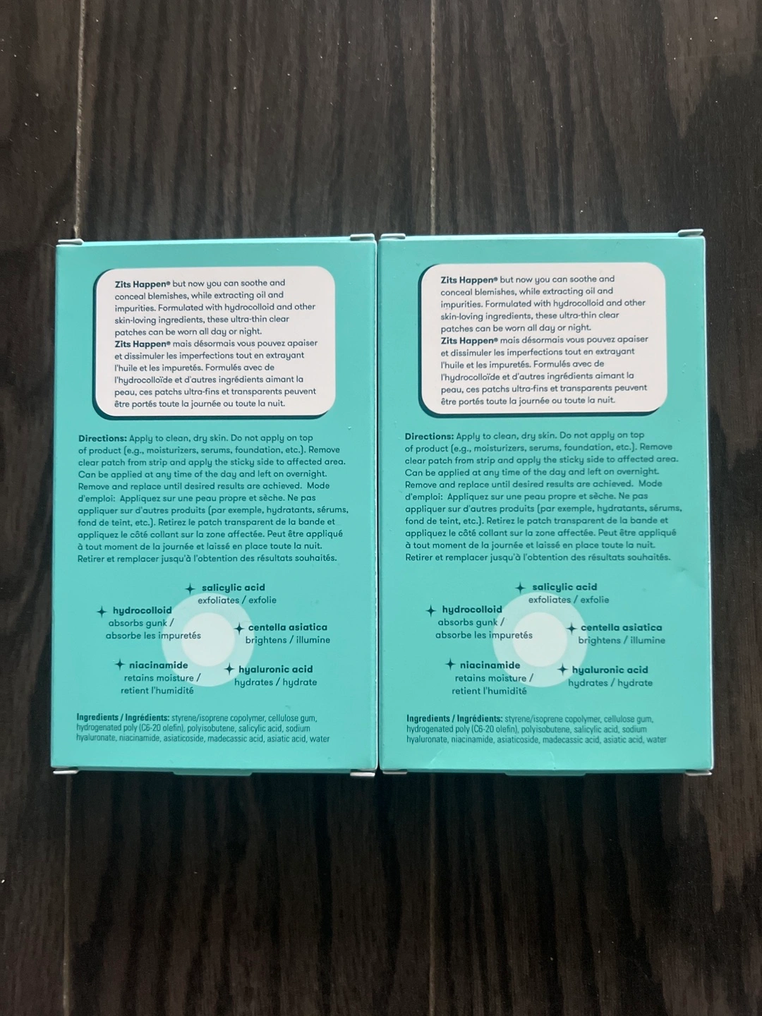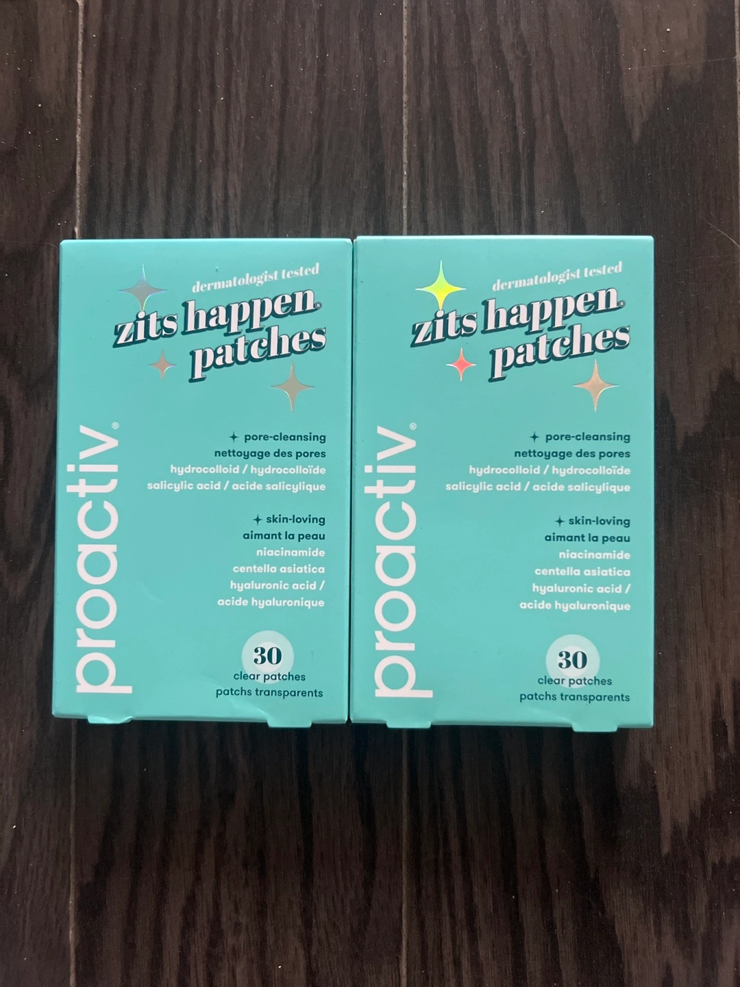 Two boxes of Proactiv Zits Happen patches. Each box contains 30 clear patches. Dermatologist tested. Pore-cleansing hydrocolloid. Salicylic acid. Centella asiatica. Hyaluronic acid. For spot treatment. $10 each or $15 for both