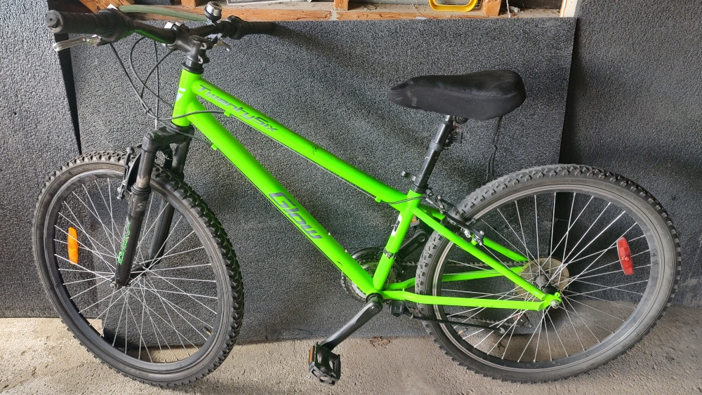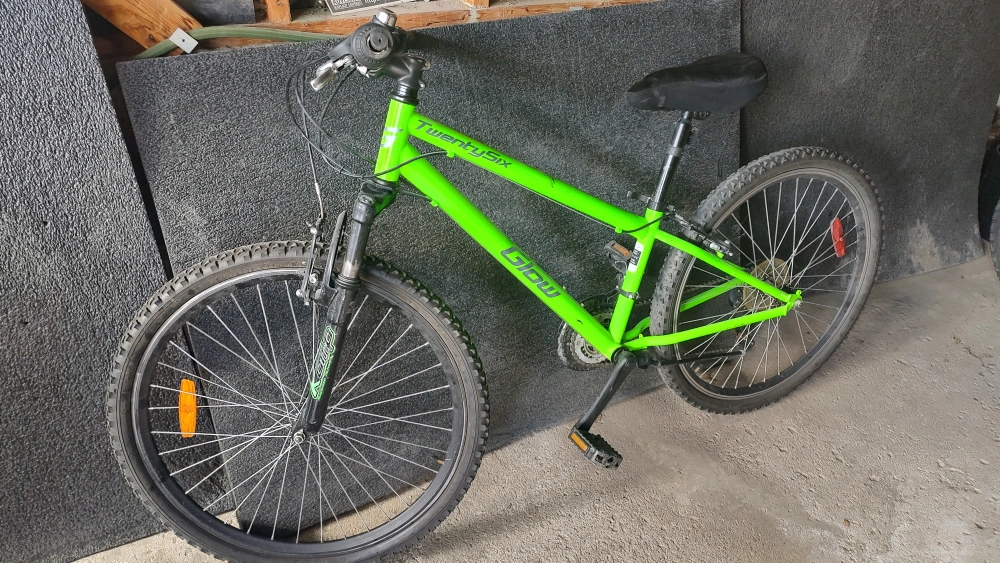 Bright green mountain bike. Twenty-six inch wheels. Front suspension forks. Good condition. Ready to ride.