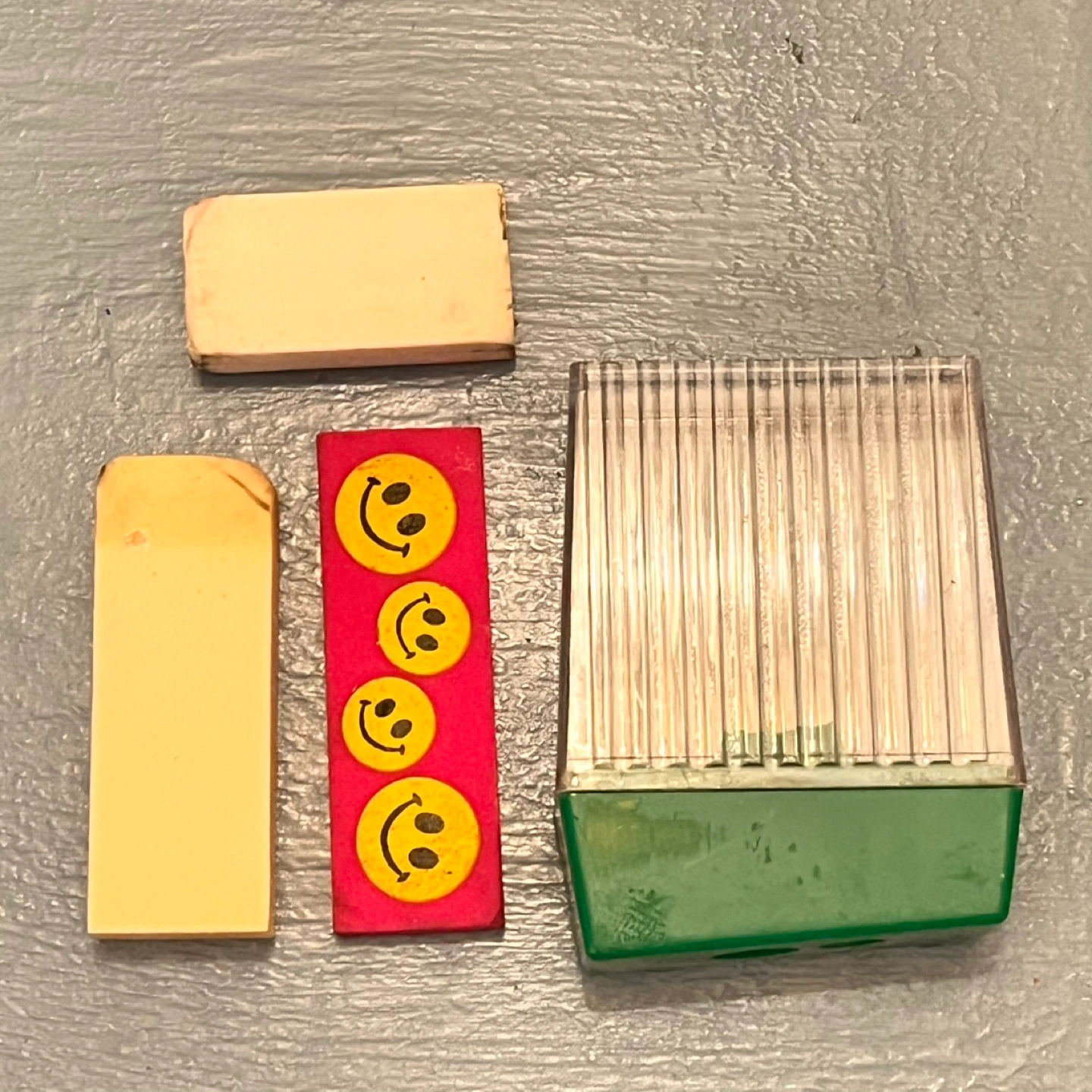Three erasers and a vintage green pencil sharpener. Both erasers are used except the pink one. These are super old! (Early 00s). Happy to offer to anyone in need of additional supplies for art or school.
