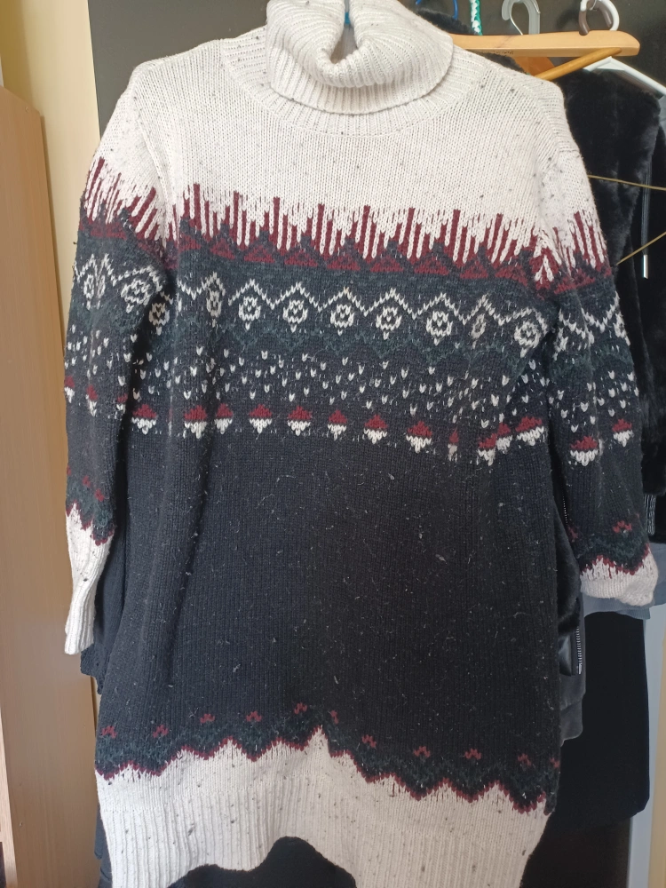Women's fair isle turtleneck sweater. Features a cream, black, and burgundy pattern. Long sleeves. Cozy and warm. Great for fall and winter. yonge and Sheppard pick up