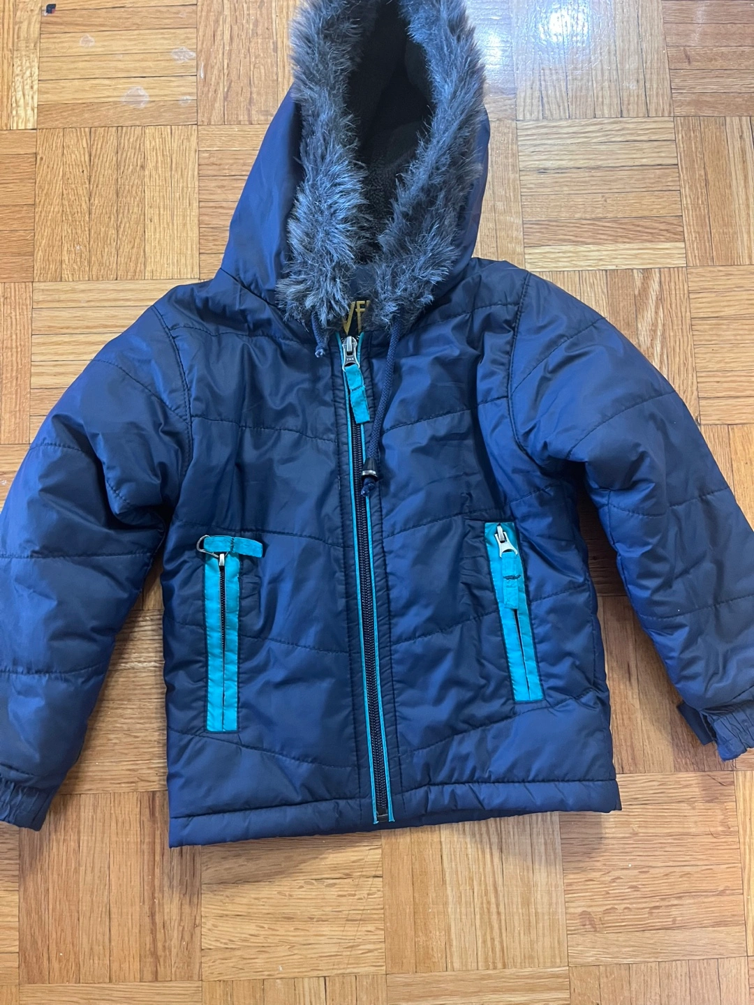Warm winter jacket. Features a navy blue quilted exterior, teal zipper and accents, and a faux fur-trimmed hood. Great for cold weather. No wear and tear. price will be discounted if buying more than 1 item