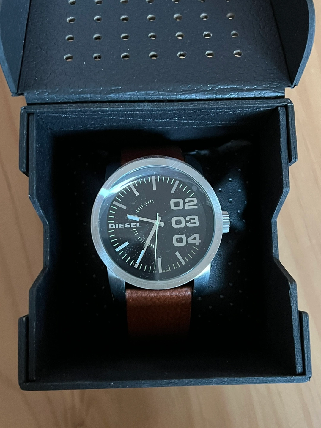 Gents Diesel watch. Brown leather strap. Quartz movement. Comes in original box. Brand New - Unworn! Received as a gift, needs a new battery