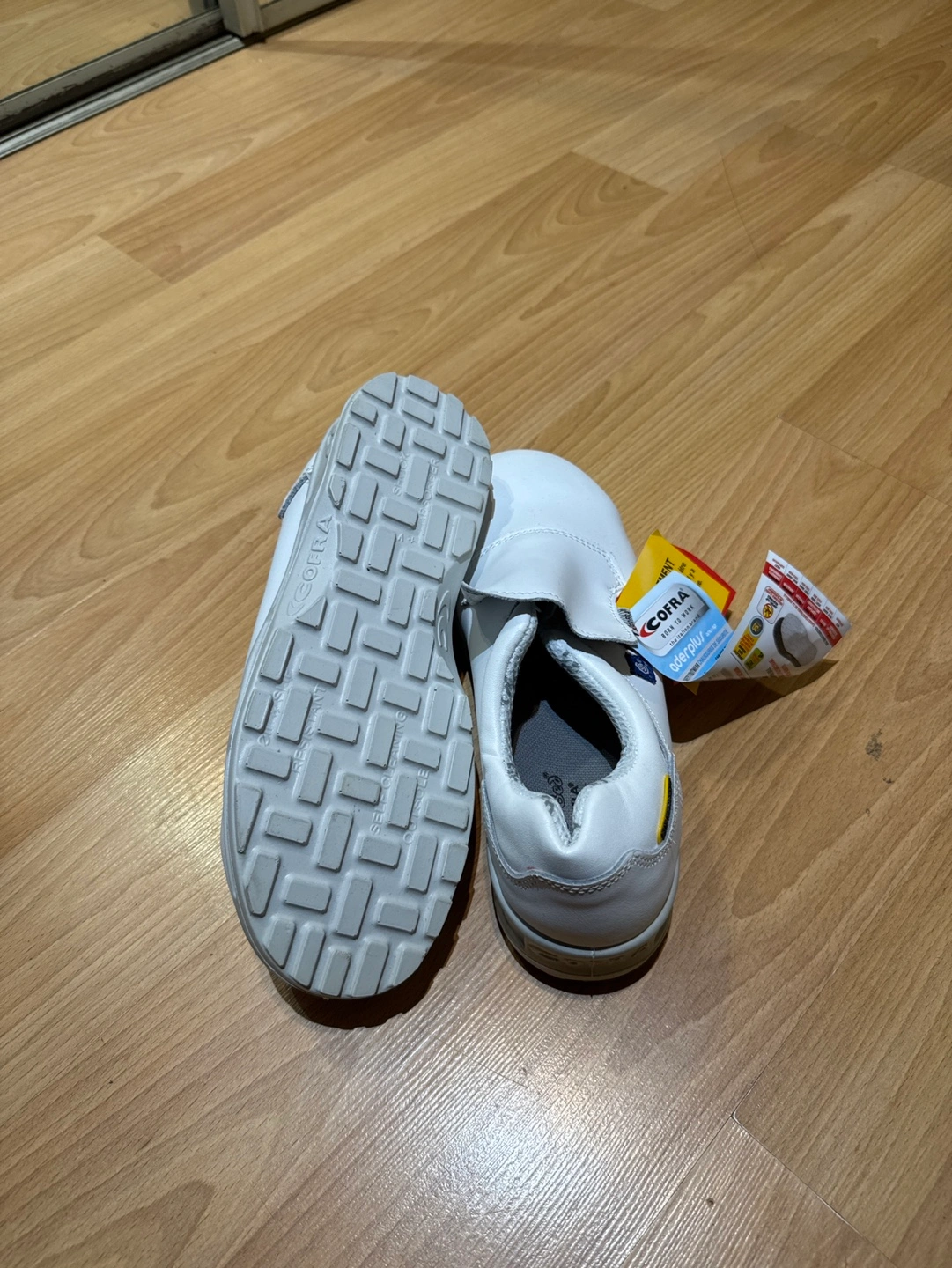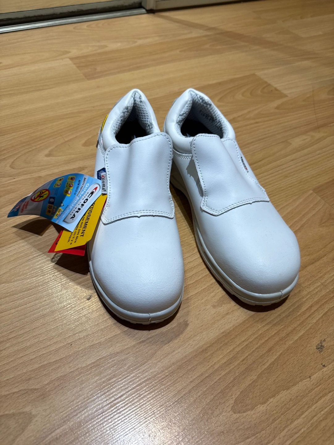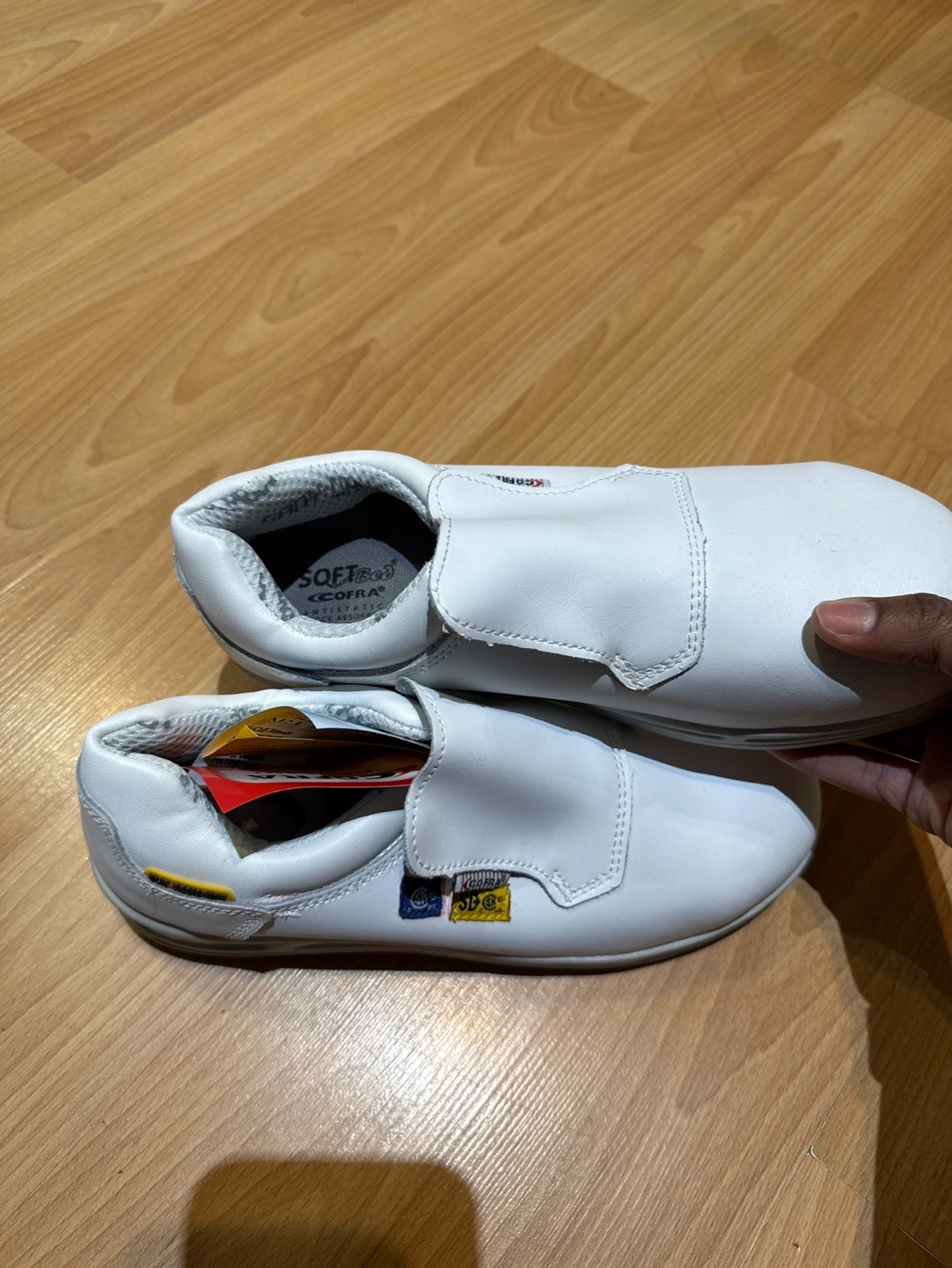 White leather slip-on safety shoes. New with tags. Lightweight and comfortable. Ideal for work or casual wear.