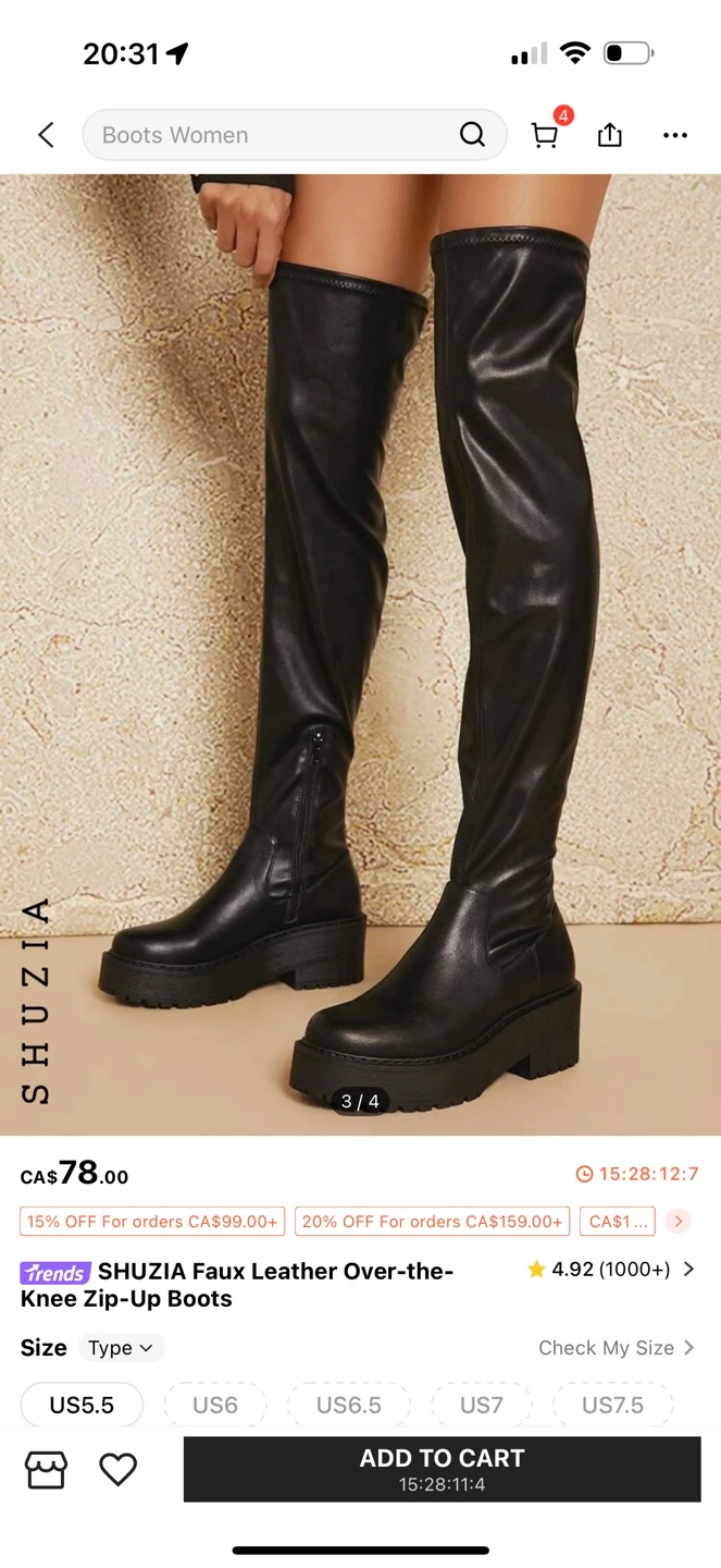 Black faux leather thigh-high boots. Zip-up closure. Platform sole. Size 8, worn twice