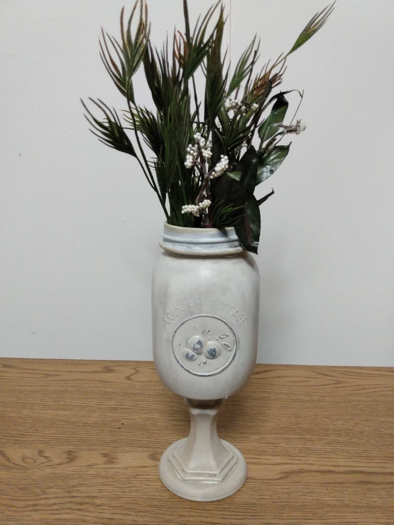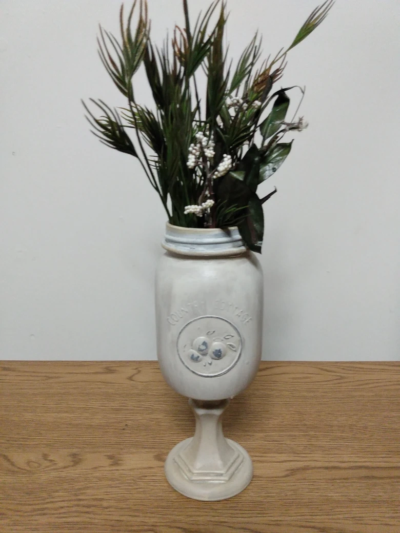 Upcycled mason jar vase. Features a painted design and sits on a painted pedestal. Perfect for small bouquets or home decor.