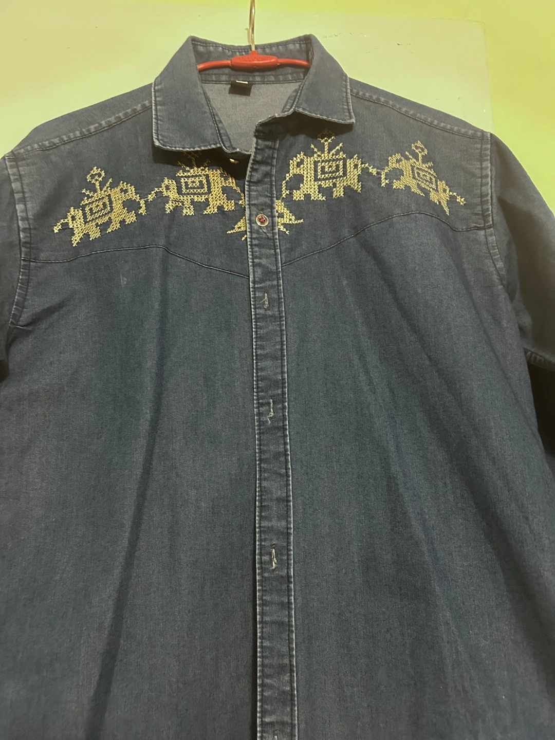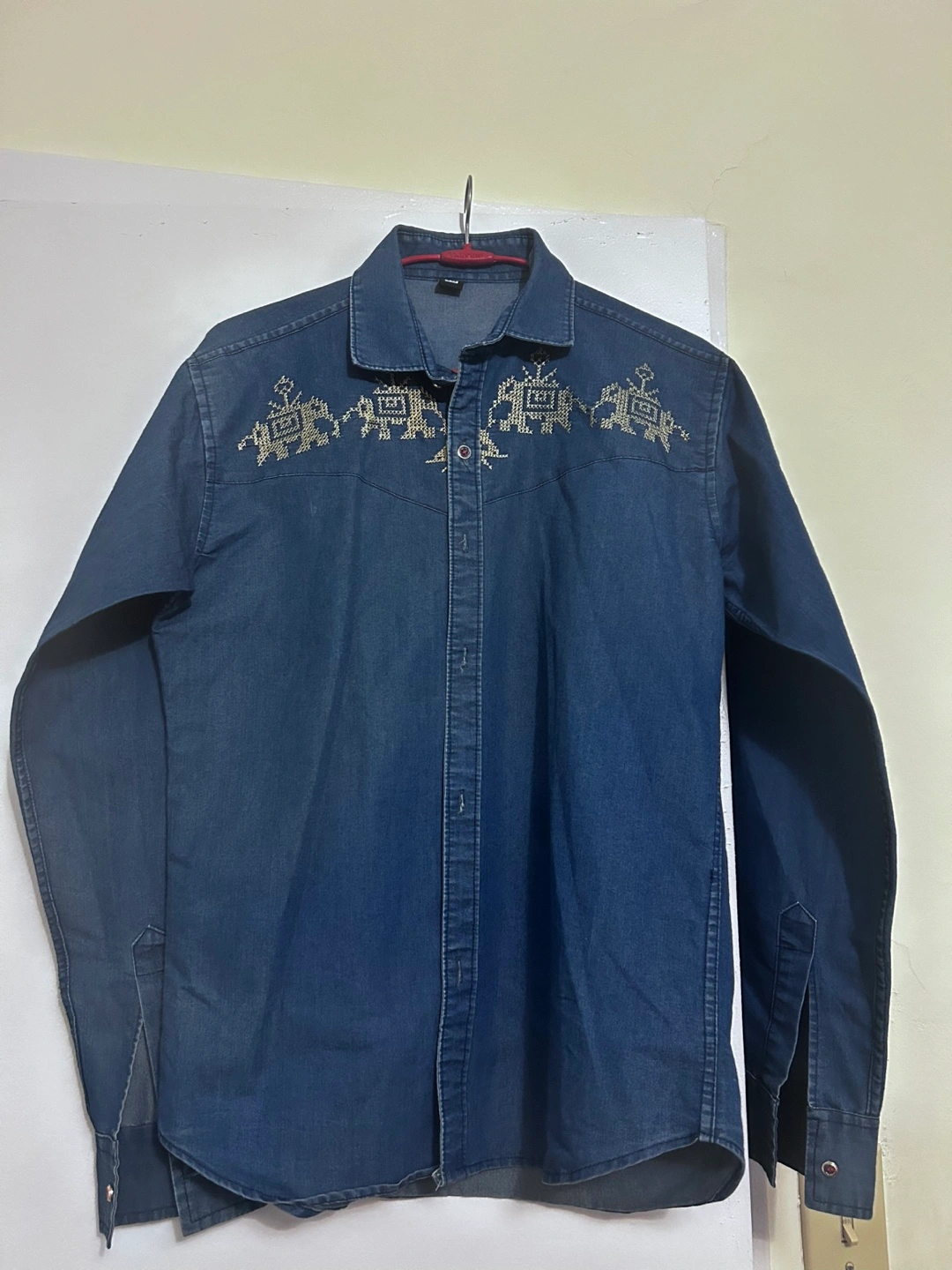 Long-sleeved denim shirt. Features embroidered design across the shoulders. Button-down closure. Size -12 years above If you like please contact me before march 28. Pet free and smoke free home