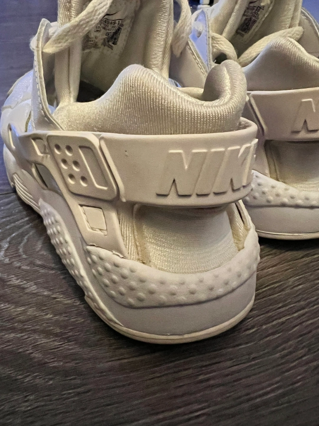 Pre-owned white Nike Air Huarache sneakers. Minor wear and tear. Great for everyday use. US 1Y