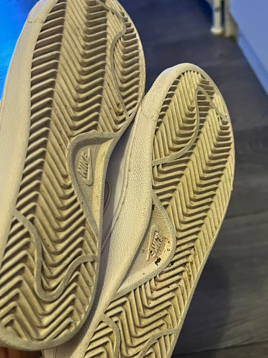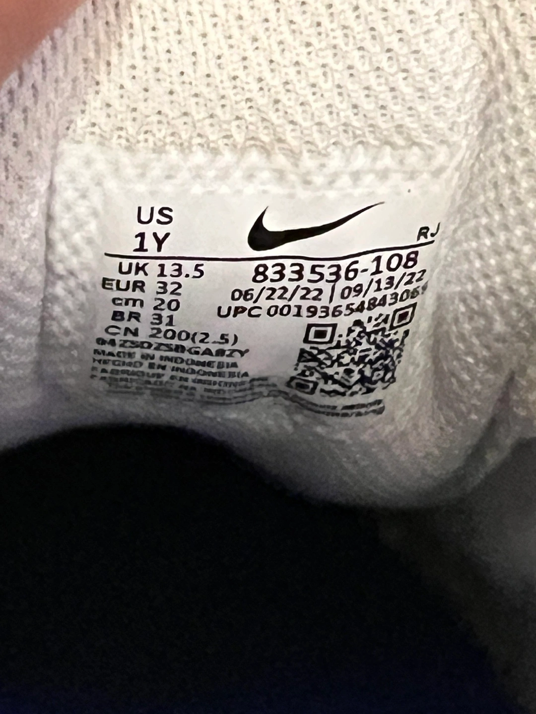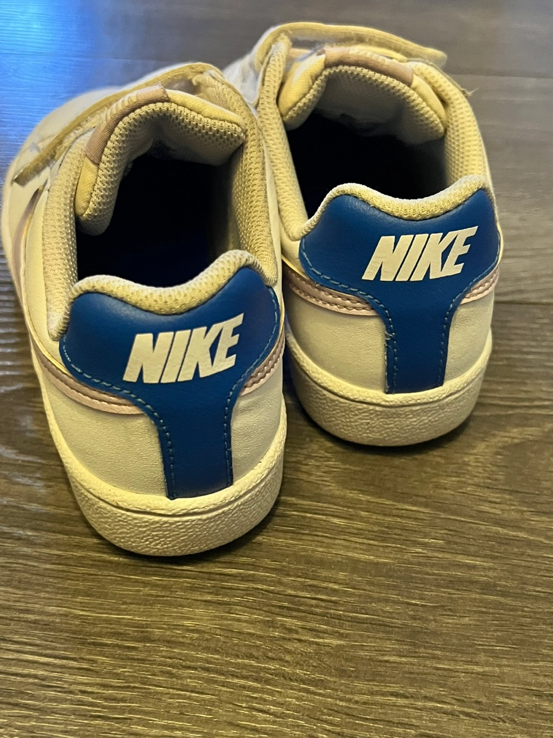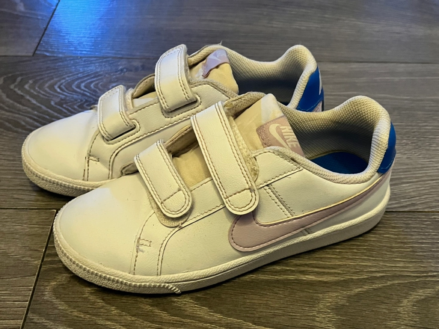 White leather toddler shoes. Blue and purple accents. Velcro straps. Size 1Y (US). Pre-owned.