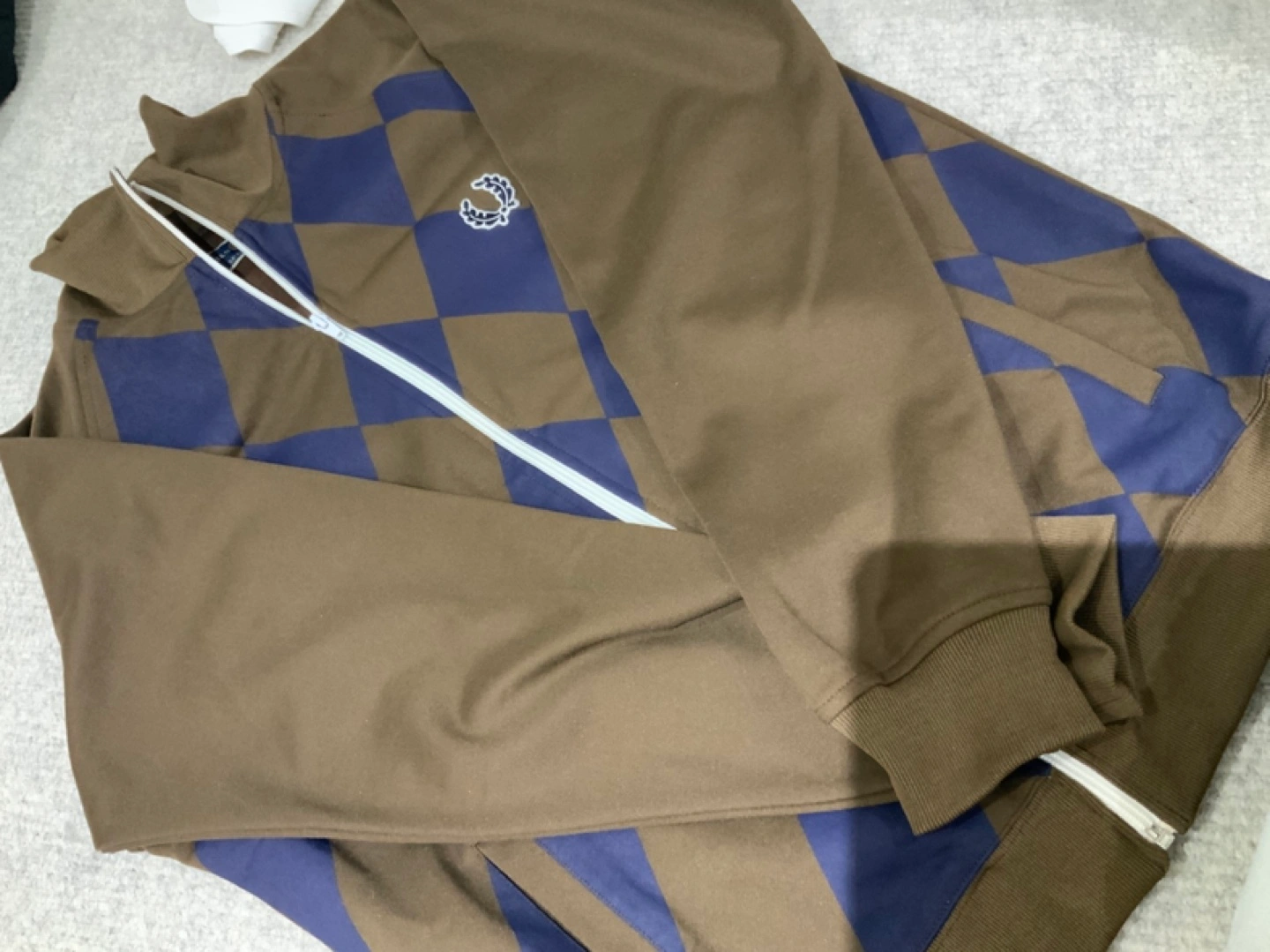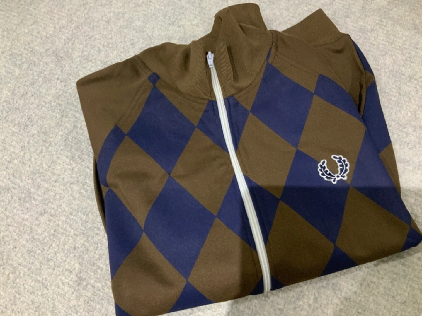 Brown and navy track jacket. Harlequin diamond pattern. Full zip. Size Large. Worn twice