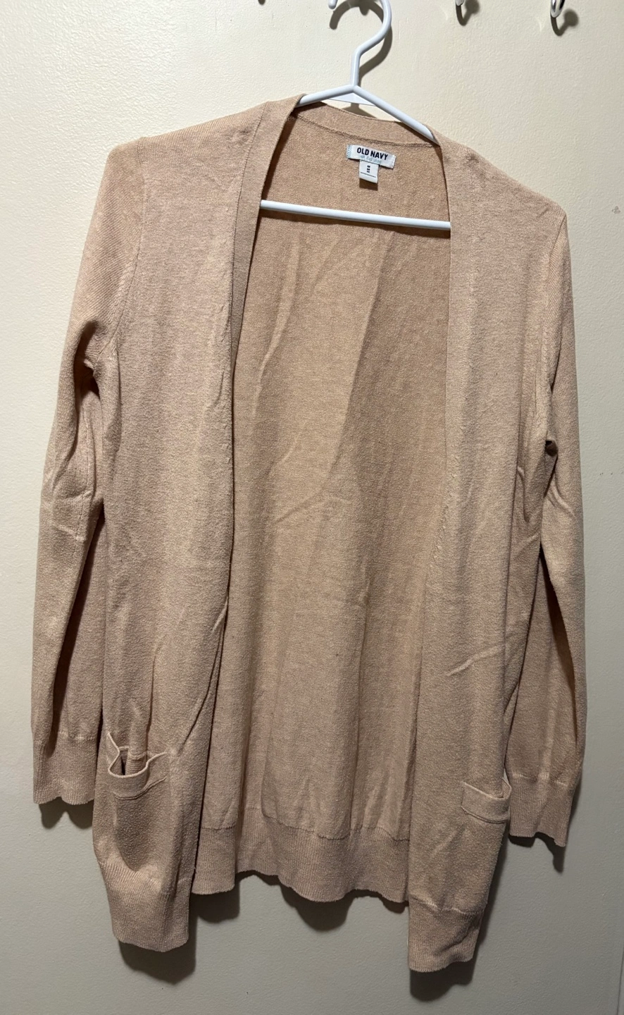 Long-sleeve cardigan, beige colour. Open front, with pockets. Size medium.