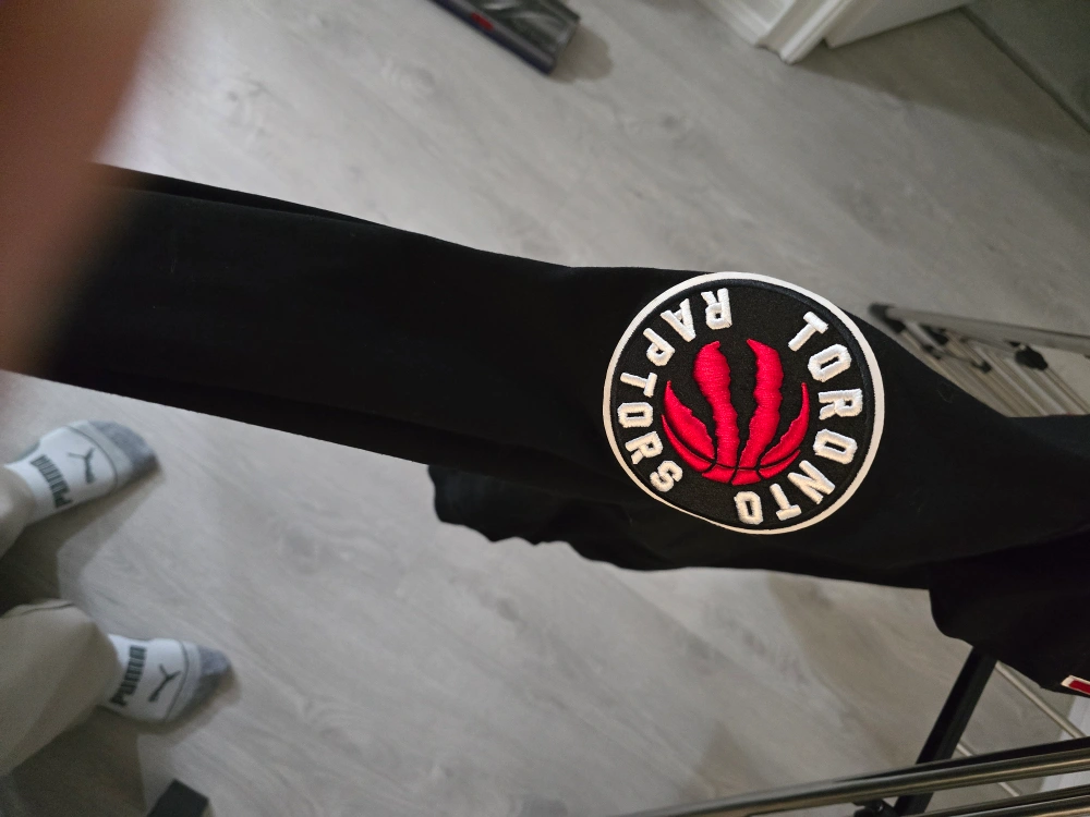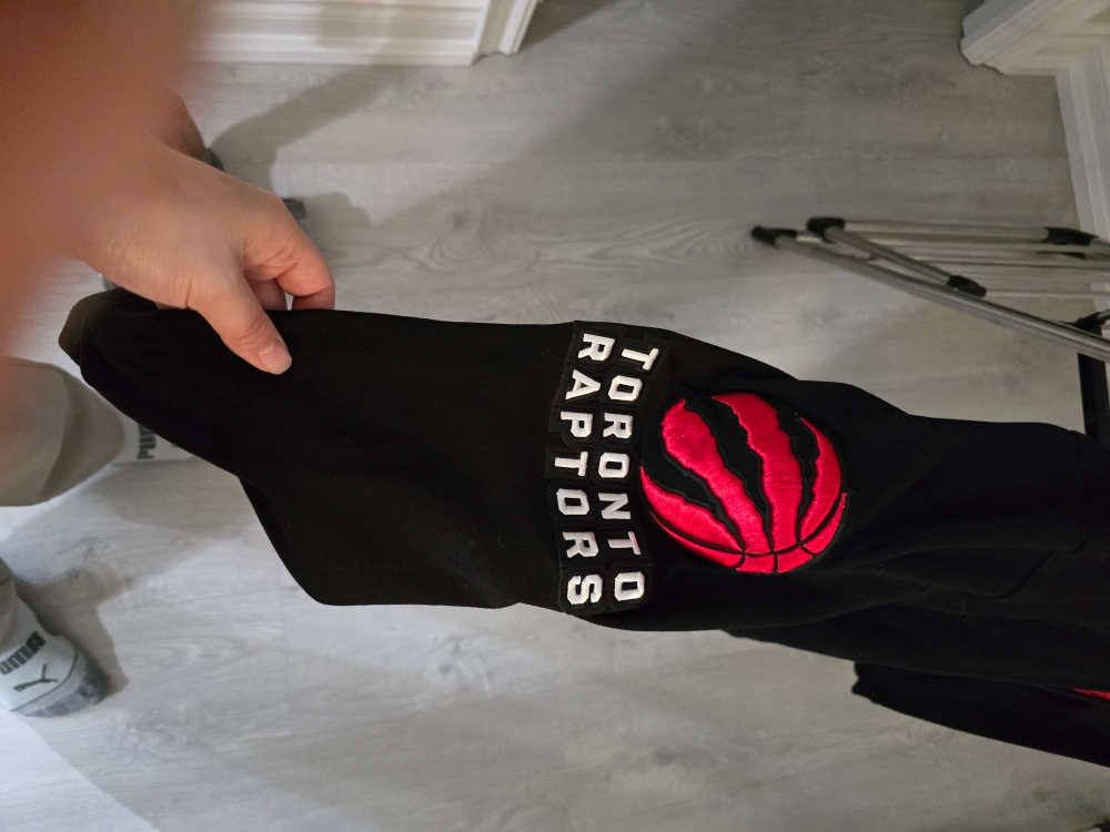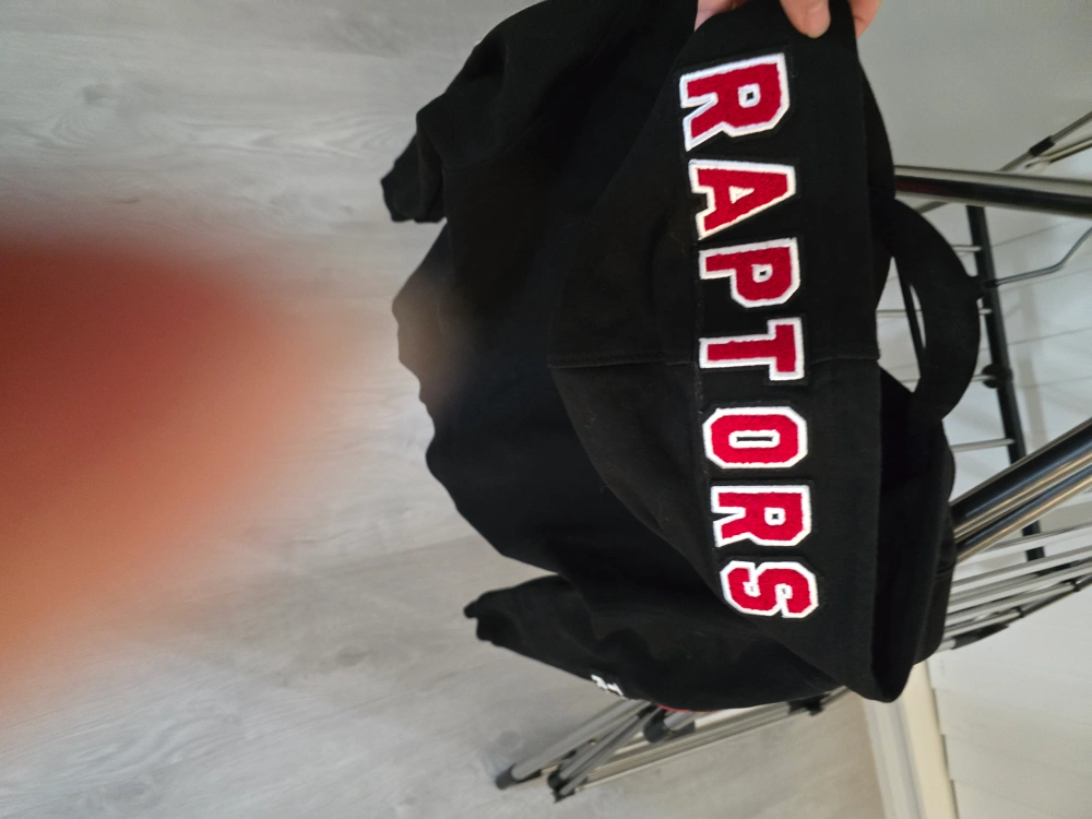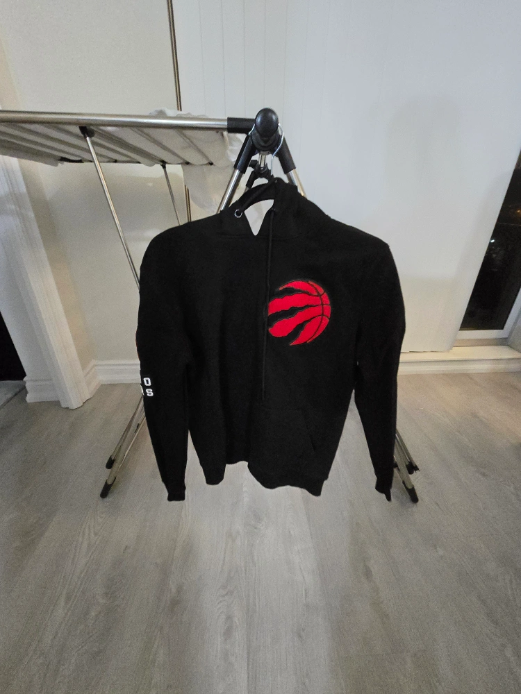 Black hoodie features Toronto Raptors logo on chest and sleeves. Men's size. Good condition.