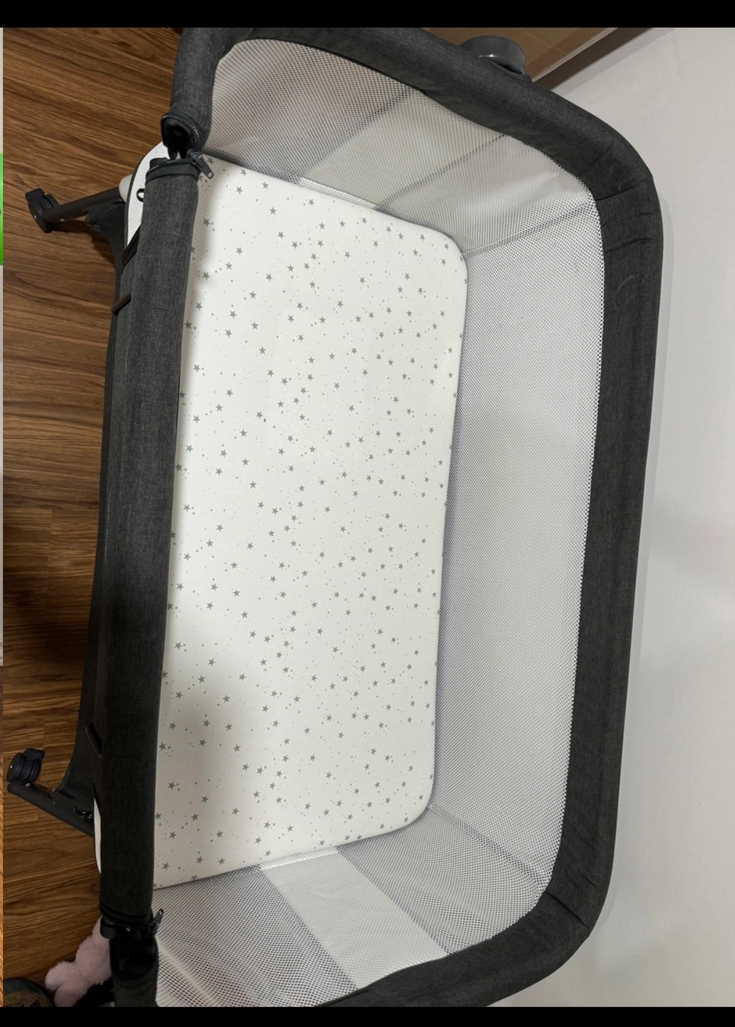 Grey fabric bassinet. Portable design, easy to assemble and move. Includes storage shelf. Mesh sides for breathability. Mattress included. Gently used.