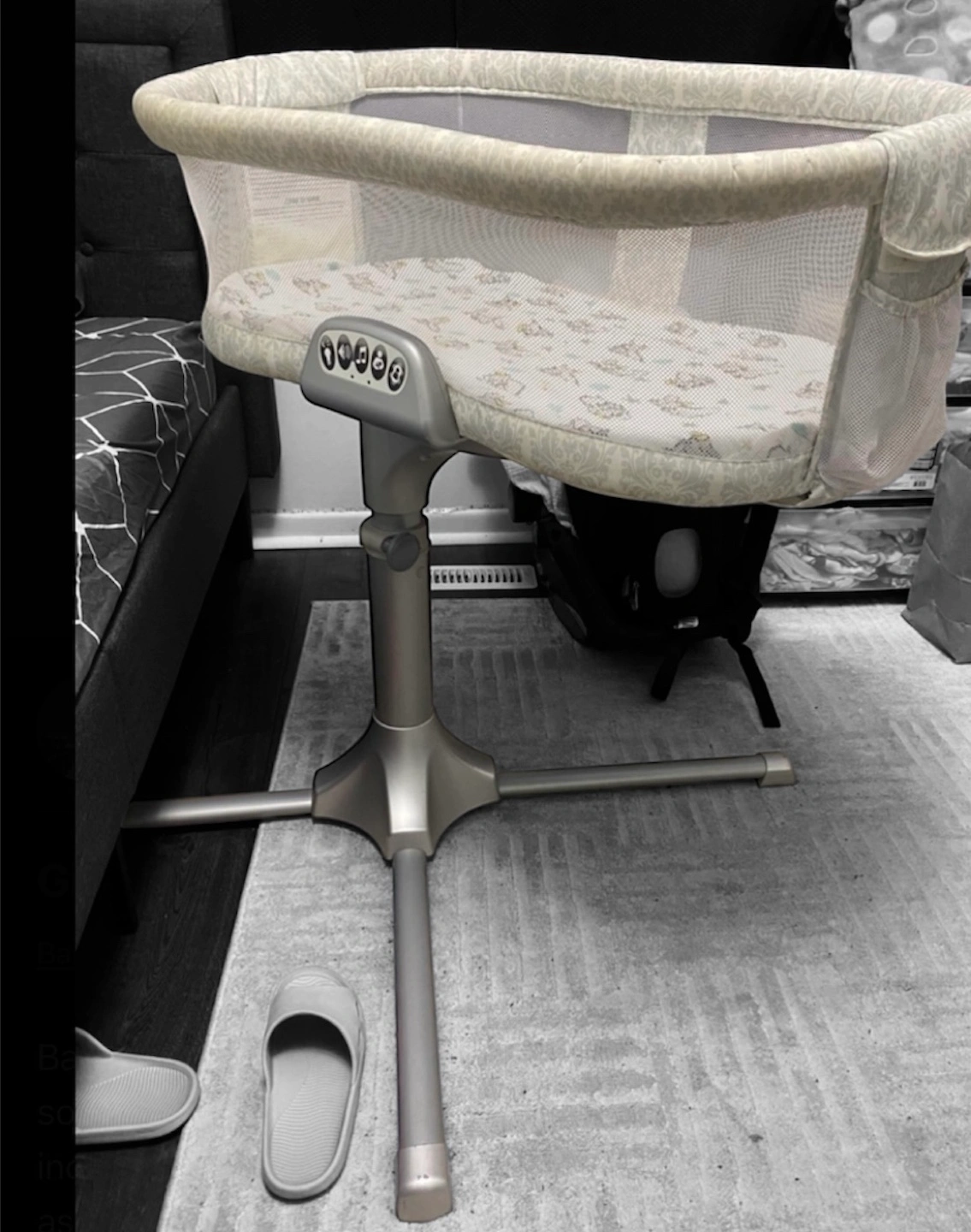 Infant bassinet with vibration feature. Neutral colours. Includes stand for easy mobility. Gently used.