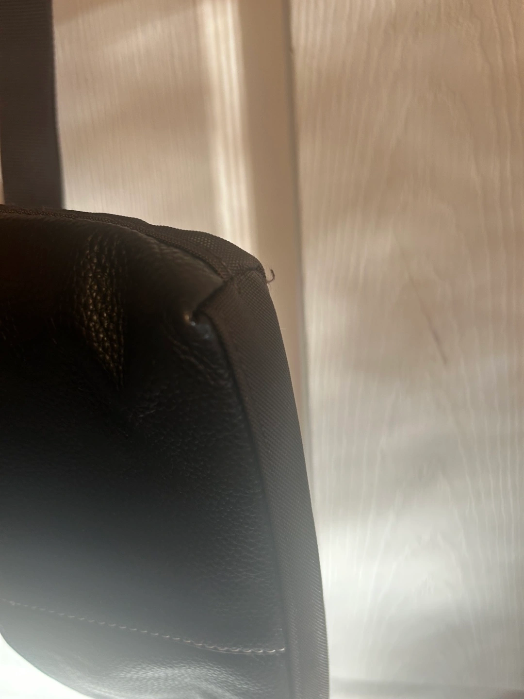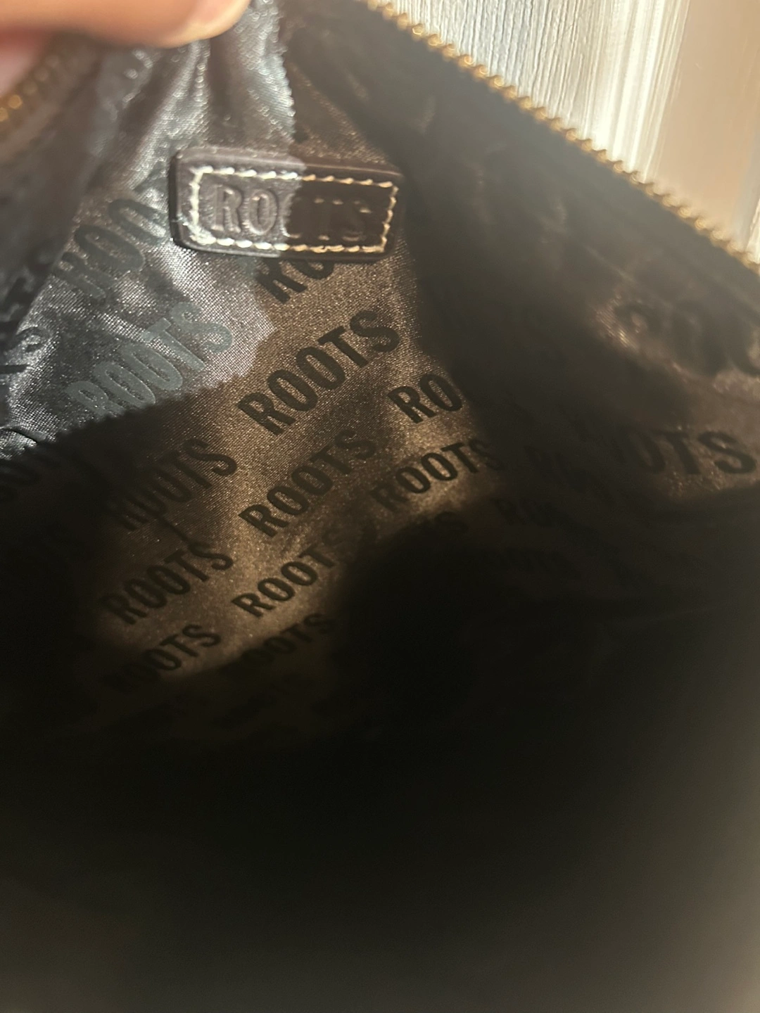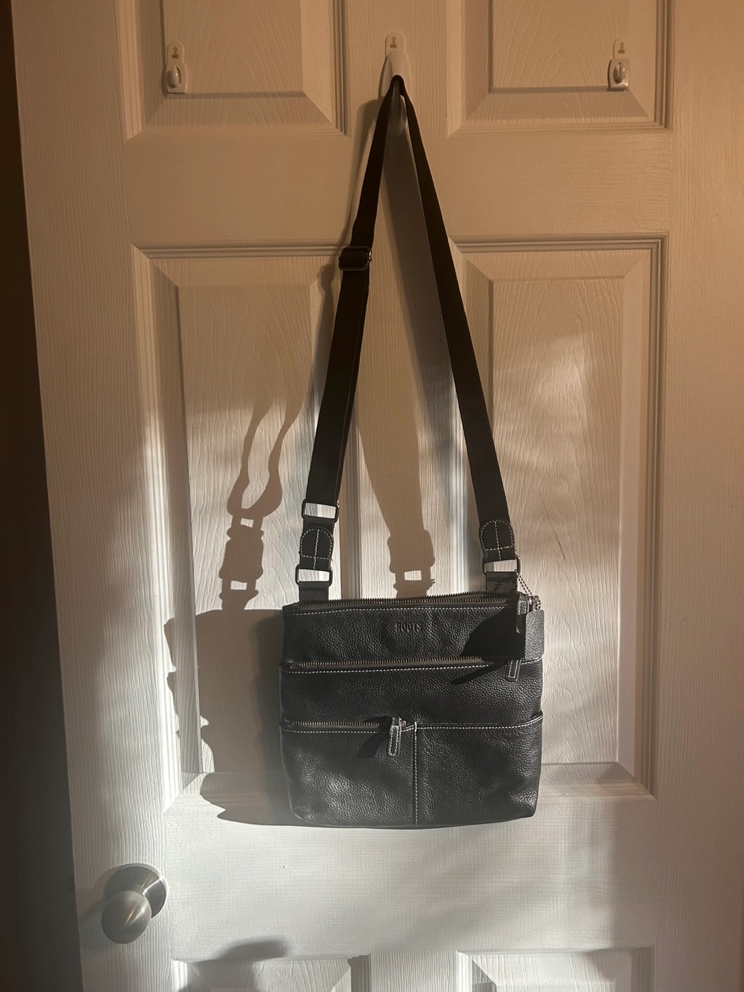 Dark Brown ROOTS leather crossbody bag. Multiple zippered compartments. Adjustable strap.