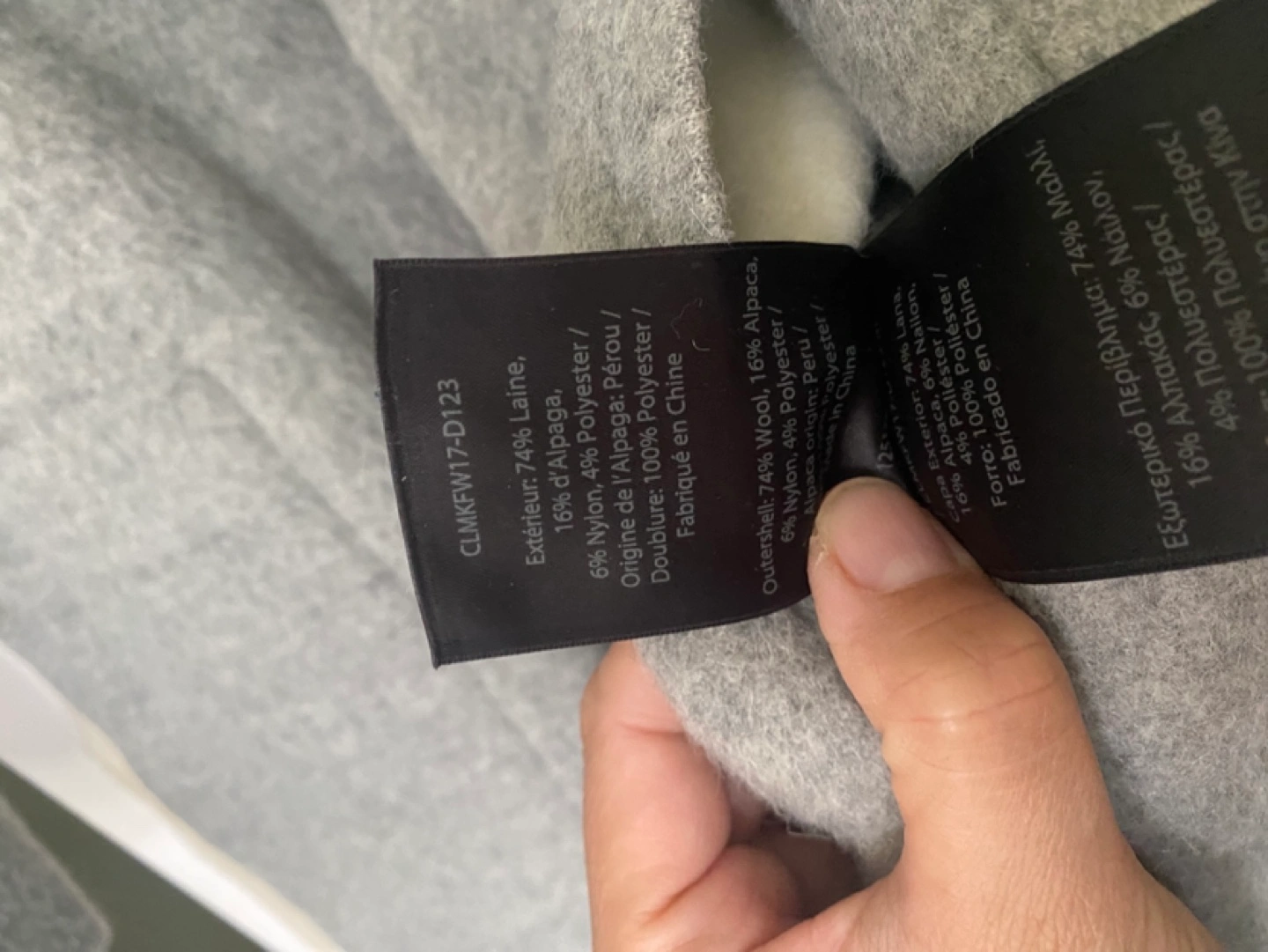 Grey and cream wool-alpaca blend coat. Double-breasted with a self-belt. Knee-length. Long sleeves. Side pockets.