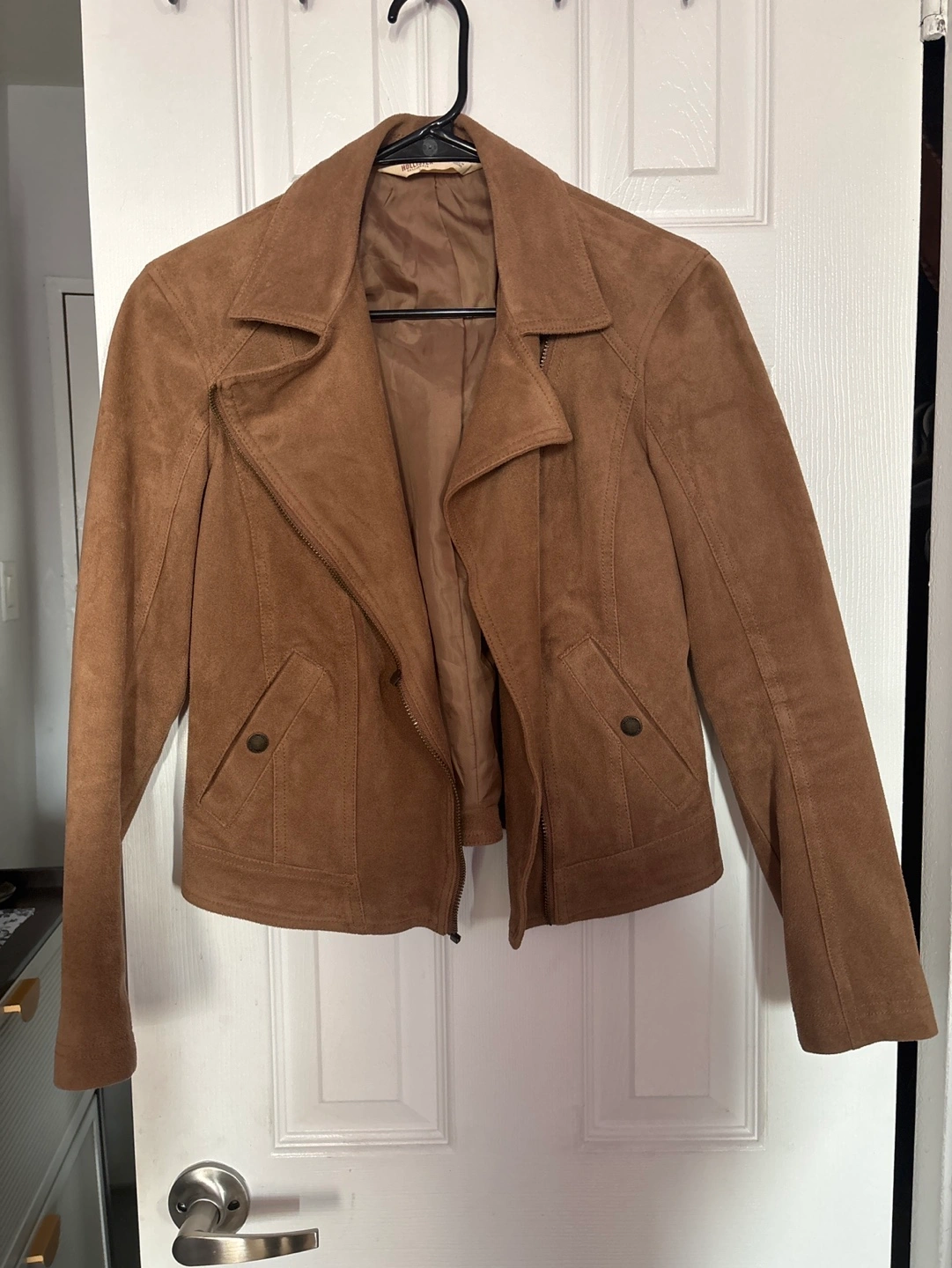 Brown suede jacket. Features a zipper closure, fringe detail at the back, and two pockets. Size small. Excellent condition.