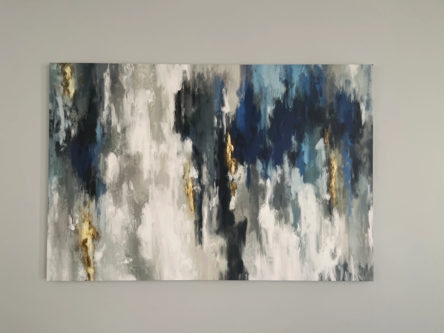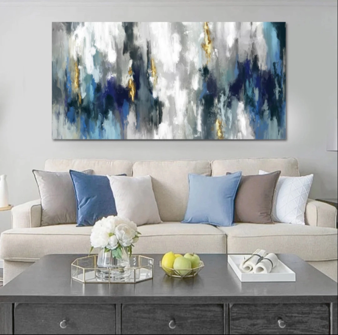 Large abstract canvas painting. Features shades of blue, grey, and gold. Modern and stylish piece for home decor. 1 Piece Stretched Canvas