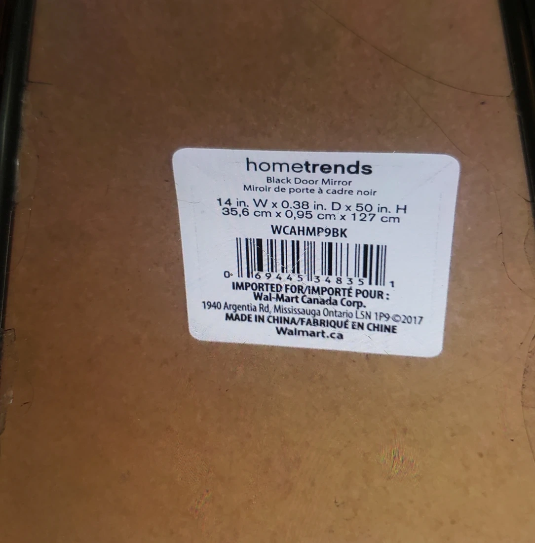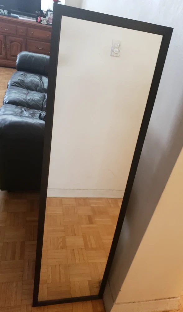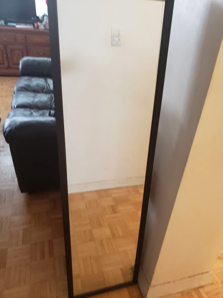 Full-length mirror. Black frame. Good condition. Measures 35.6 cm wide by 127 cm high.