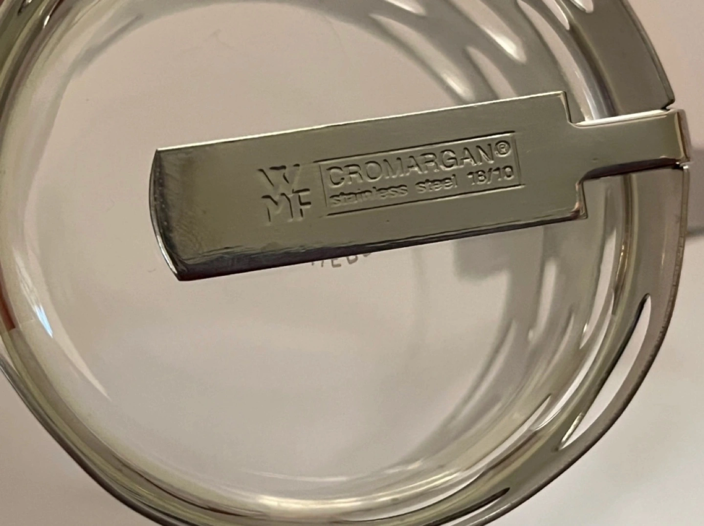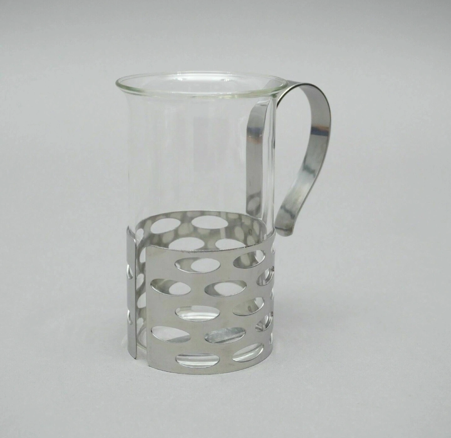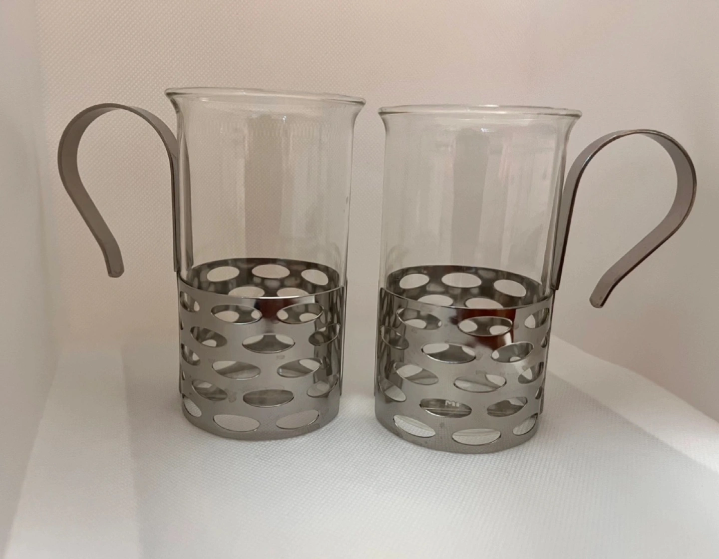 Two glass mugs with stainless steel handles and decorative bands. Crafted from Cromargan stainless steel 18/10. Excellent for tea or coffee.