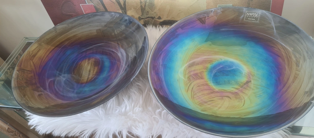 Set of two decorative glass bowls. Large size. Iridescent colours. Unique design. Perfect for centrepieces or decorative use.