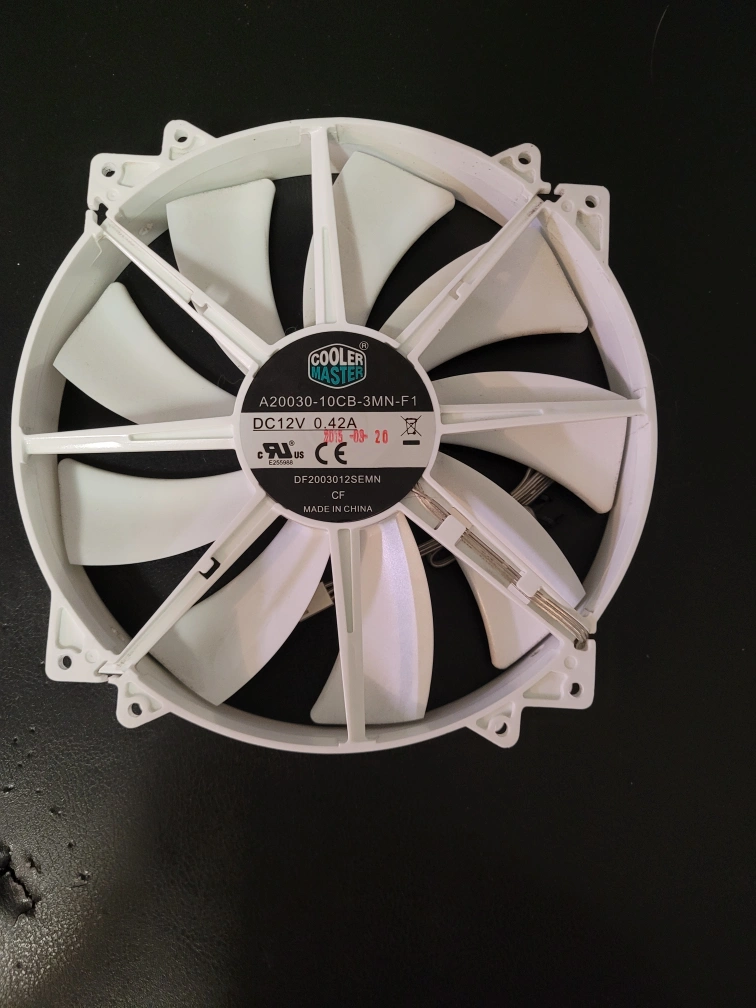 White 120mm PC fan. Model number A20030-10CB-3MN-F1. DC12V 0.42A.