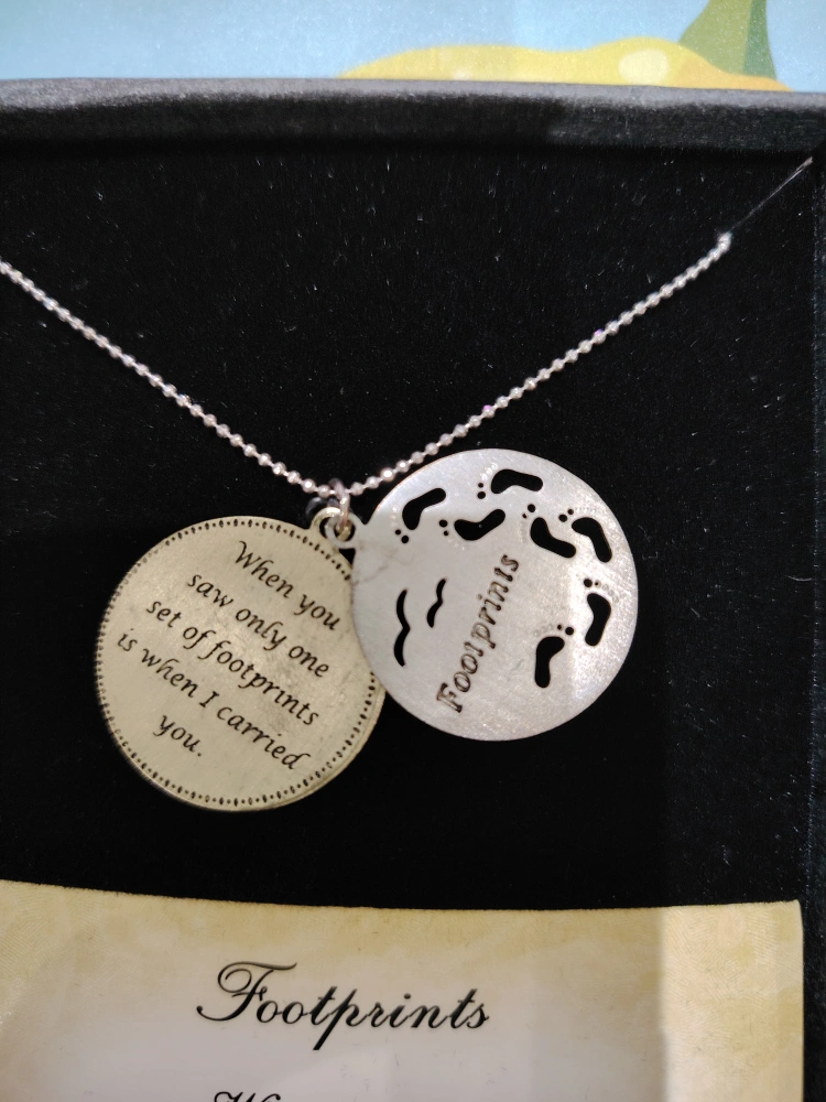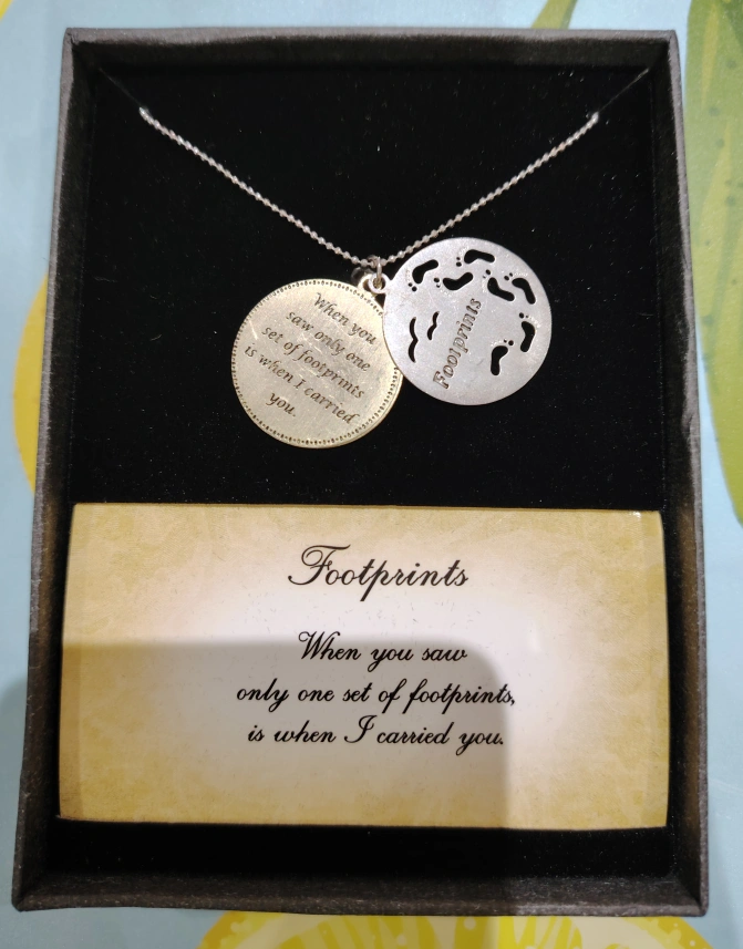 Silver-tone necklace. Features two circular pendants with footprints and an inspirational quote. Comes in a gift box. Lovely sentimental jewellery.