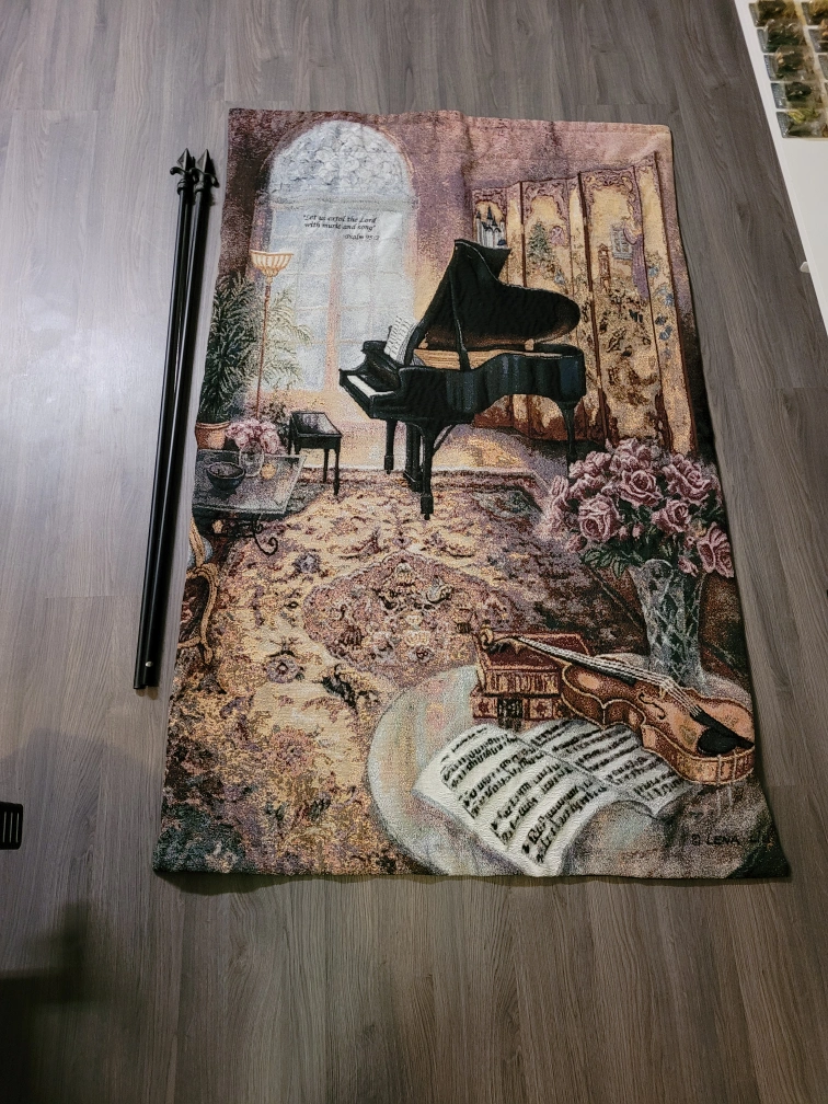Beautiful tapestry featuring a grand piano in a room setting. Includes two black decorative rods. Sheet music and violin also depicted. Psalm 92:3 quote.