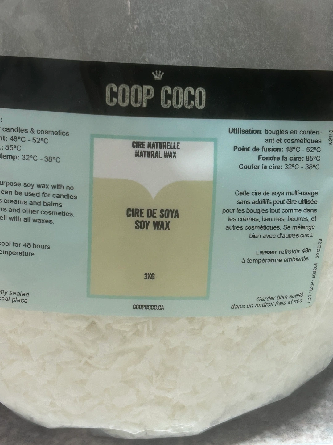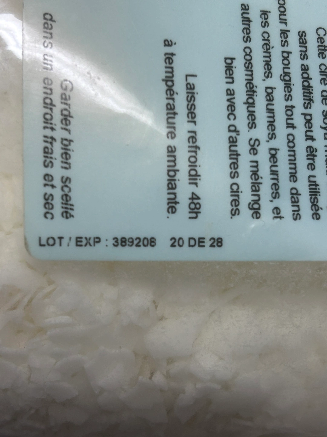 Soy wax flakes for candles and cosmetics. Melting point: 48-52°C. Keep in a cool, dry place. Lot/Exp: 20 DE 28