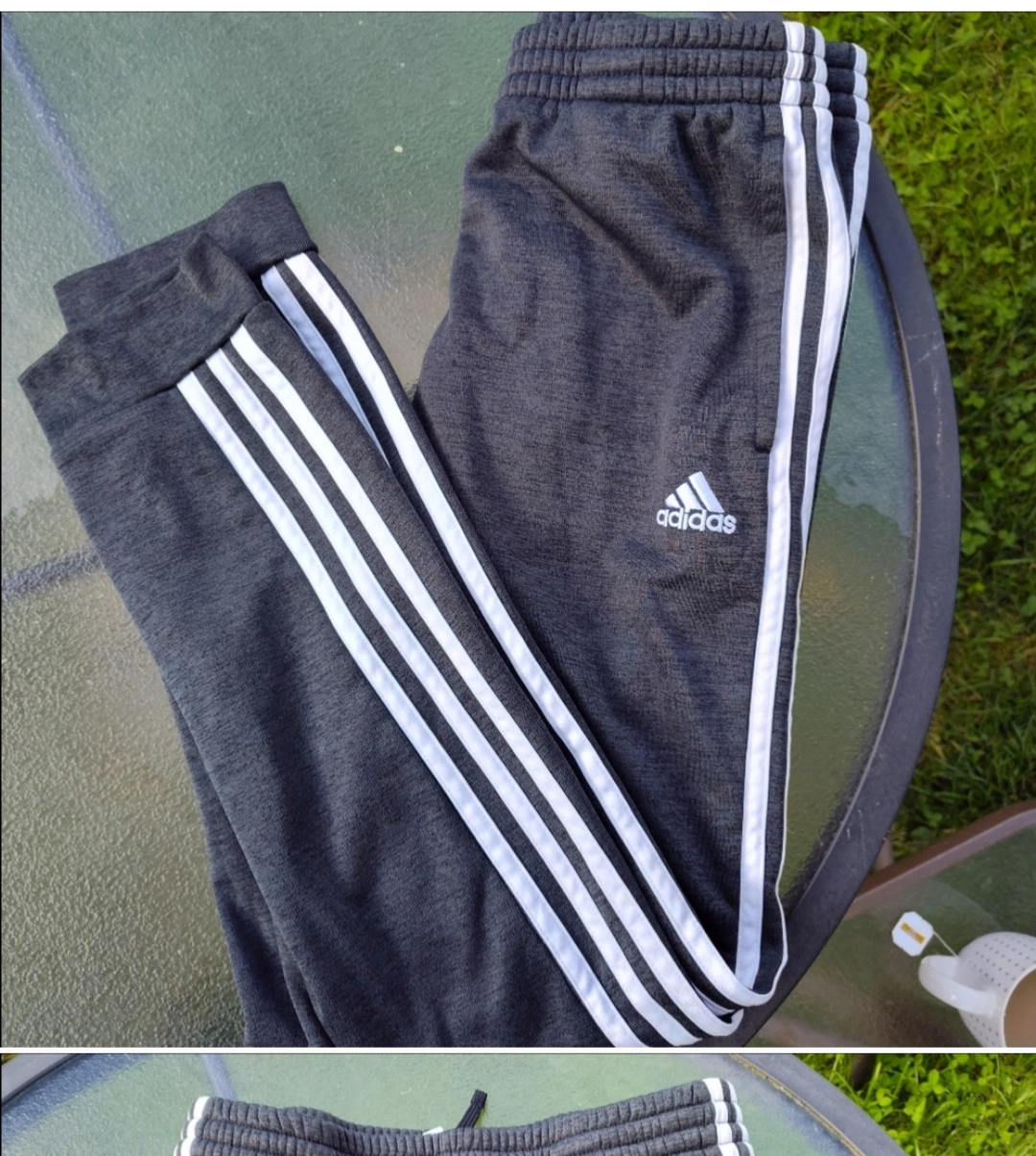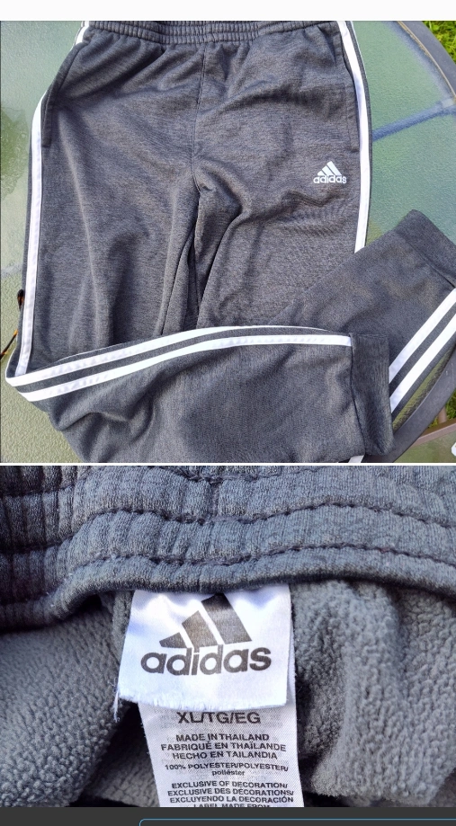Boys size XL Adidas track pants, 2 front pockets with ankle cuff, 100% polyester. Colour is steele gray. NS, small dog home.