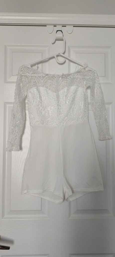 Beautiful white romper. Off-the-shoulder neckline. Three-quarter length sleeves. Lace bodice. Romper style. Lightweight material. Check out my other listing. There may be something else you're also interested.