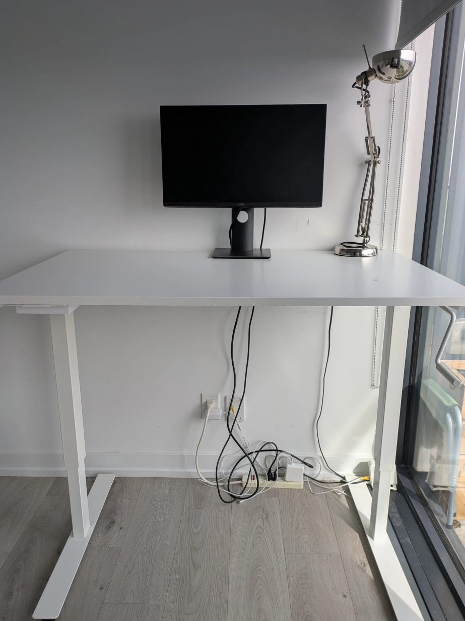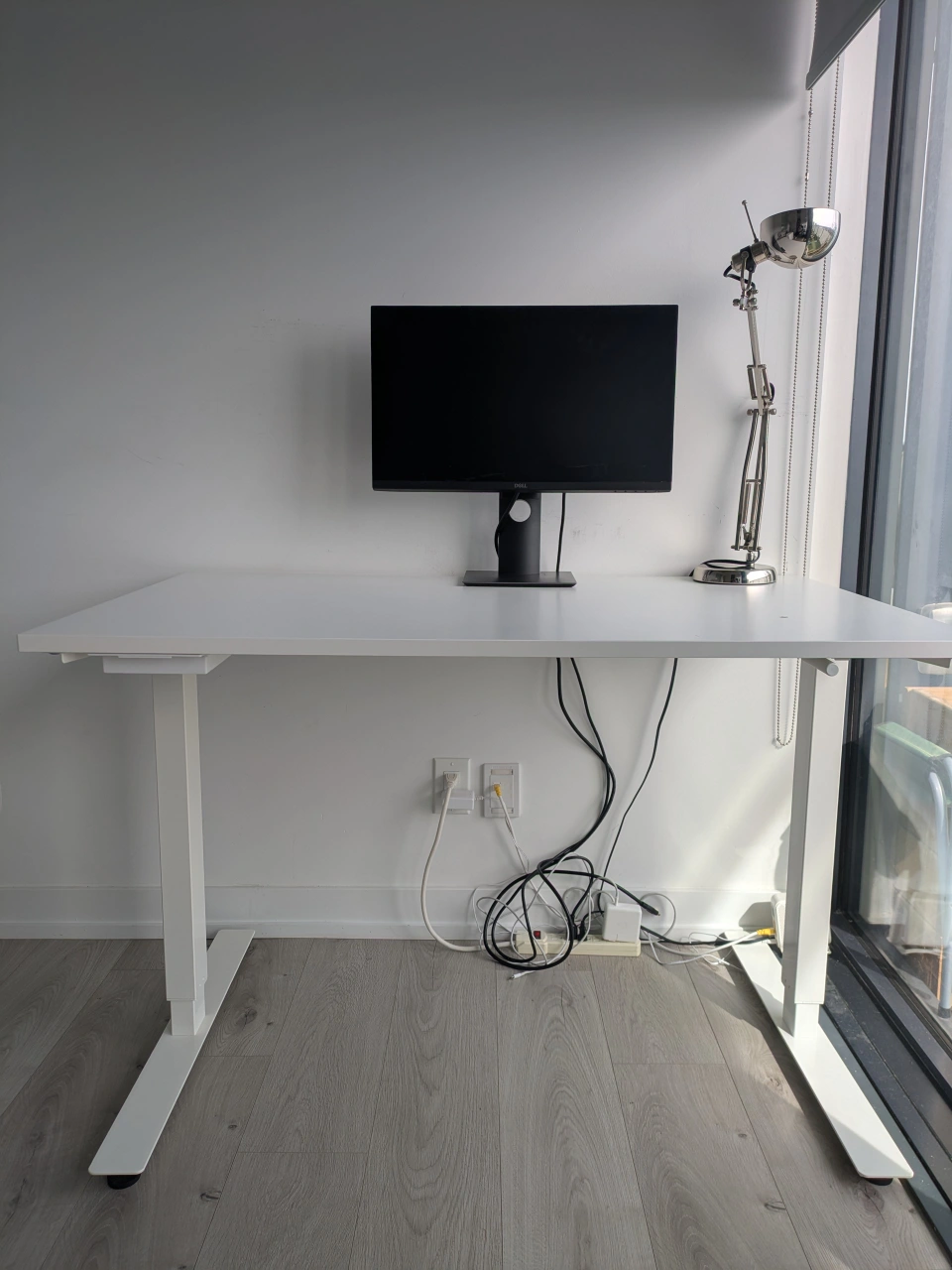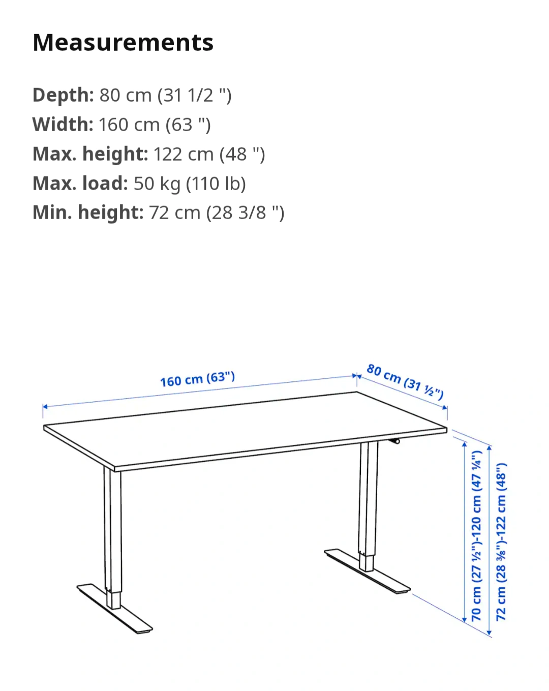 Spacious IKEA Trotten standing desk, powered by a crank handle. White tabletop and white metal legs. One dent and tiny scuff marks (see pictures), otherwise in solid condition. Dimension details in last photo (min height 72 cm, max heights 122 cm). Retails for $299 + tax. Moving sale - check out my other listings ✨