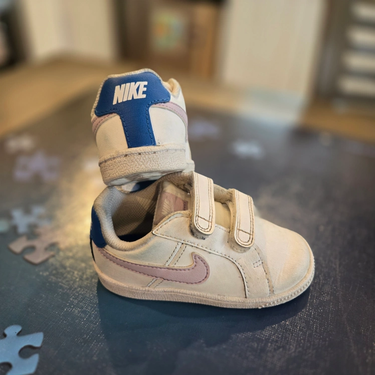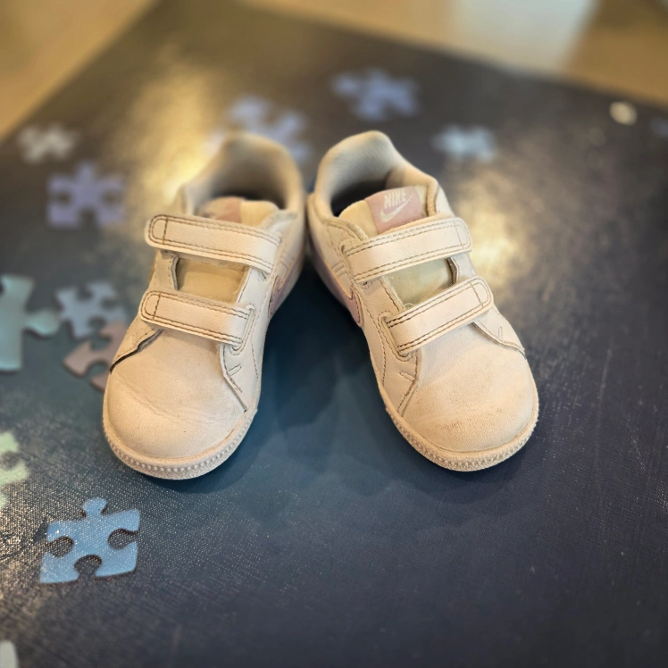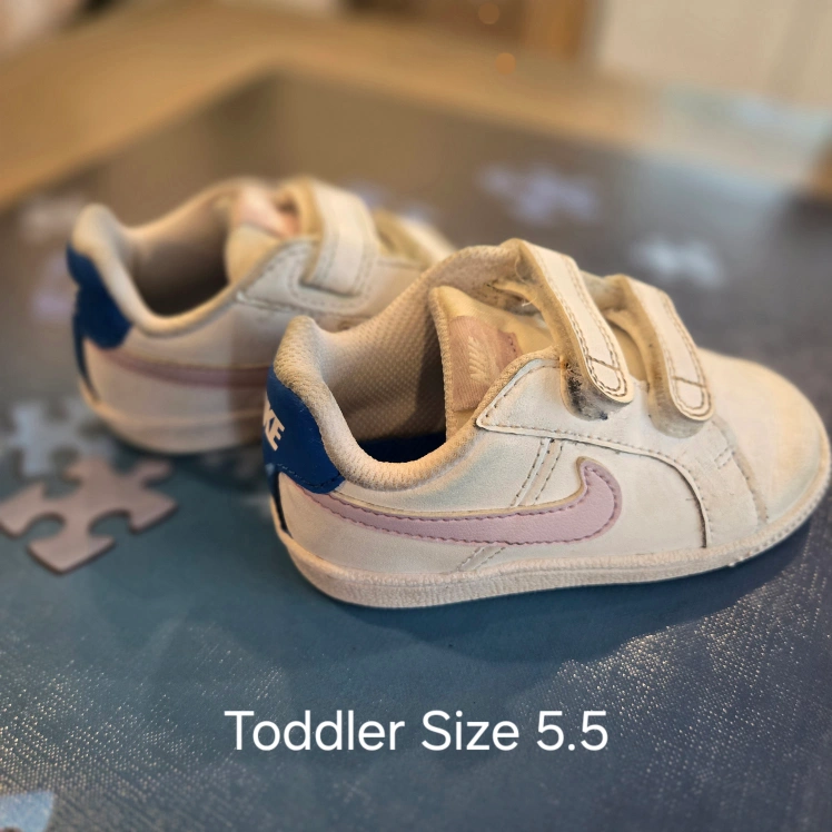 Adorable toddler sneakers. White leather upper, pink and blue accents. Velcro straps. Pre-owned, some minor wear.
