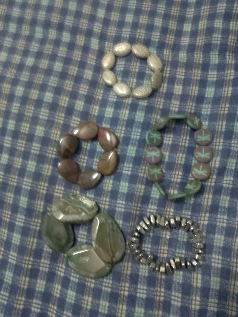 Five bracelets, various colours and materials. Stone and metal beads. Good for layering or individual wear. π I'm giving it away as I donβt like the design.