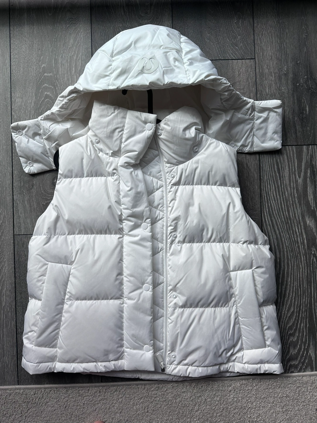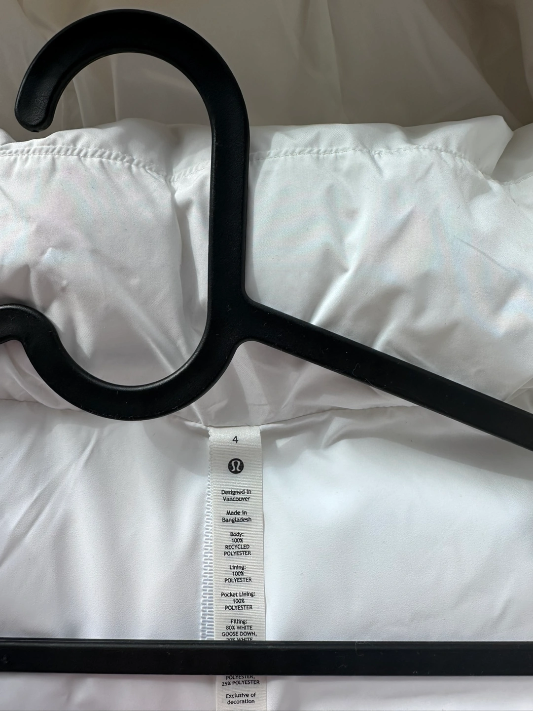 LIKE NEW Lululemon Women’s Wunder Puff 600-Down-Fill Cropped Vest in white. Never worn, just has been sitting in the closet. Size 4. Retails for $248. No stains, tears, or rips. Pickup in downtown Toronto at 407 Church St, cash ONLY. — Features: - Water-repellent - Windproof - 600-fill-power goose down insulates through extra loft - Removable hood - Cinchable hem - Zippered hand pockets with a hidden phone sleeve - Interior pockets hold the essentials Materials: Lining: 100% Polyester Pocket Lining: 100% Polyester Hood Filling: 80% Grey Goose Down, 20% Grey Goose Feather Hood Lining: 100% Recycled Polyester Hood: 100% Recycled Polyester Body: 100% Recycled Polyester Filling: 80% Grey Goose Down, 20% Grey Goose Feather Trim Filling: 75% Recycled Polyester, 25% Polyester