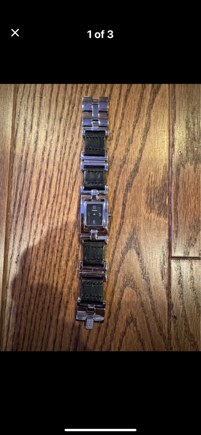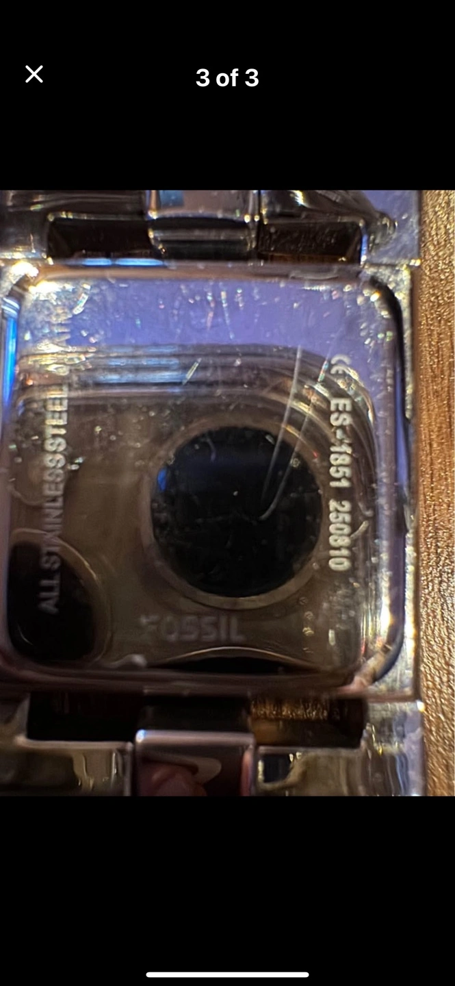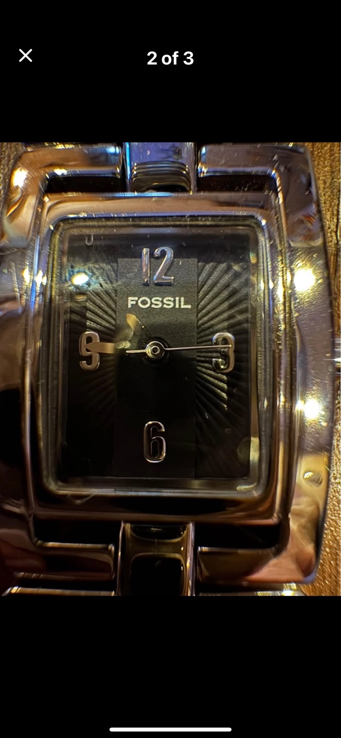 Stylish Fossil watch. Features a black face, silver toned rectangular case, and a black leather band. All stainless steel construction. Pre-owned.