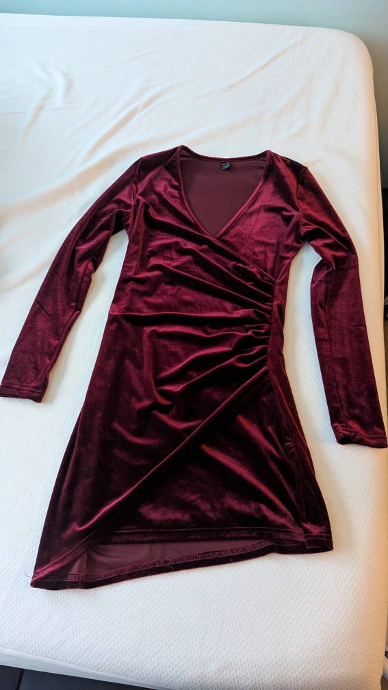 Long sleeve velvet mini dress. Burgundy colour. Wrap style. Asymmetrical hem.
