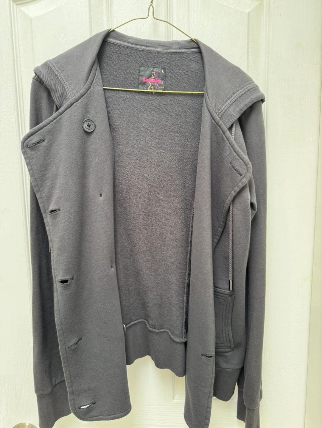 Women's hooded button up jacket. Grey colour. Elbow patches. Button accents. Drawstring hoodie. Relaxed fit.