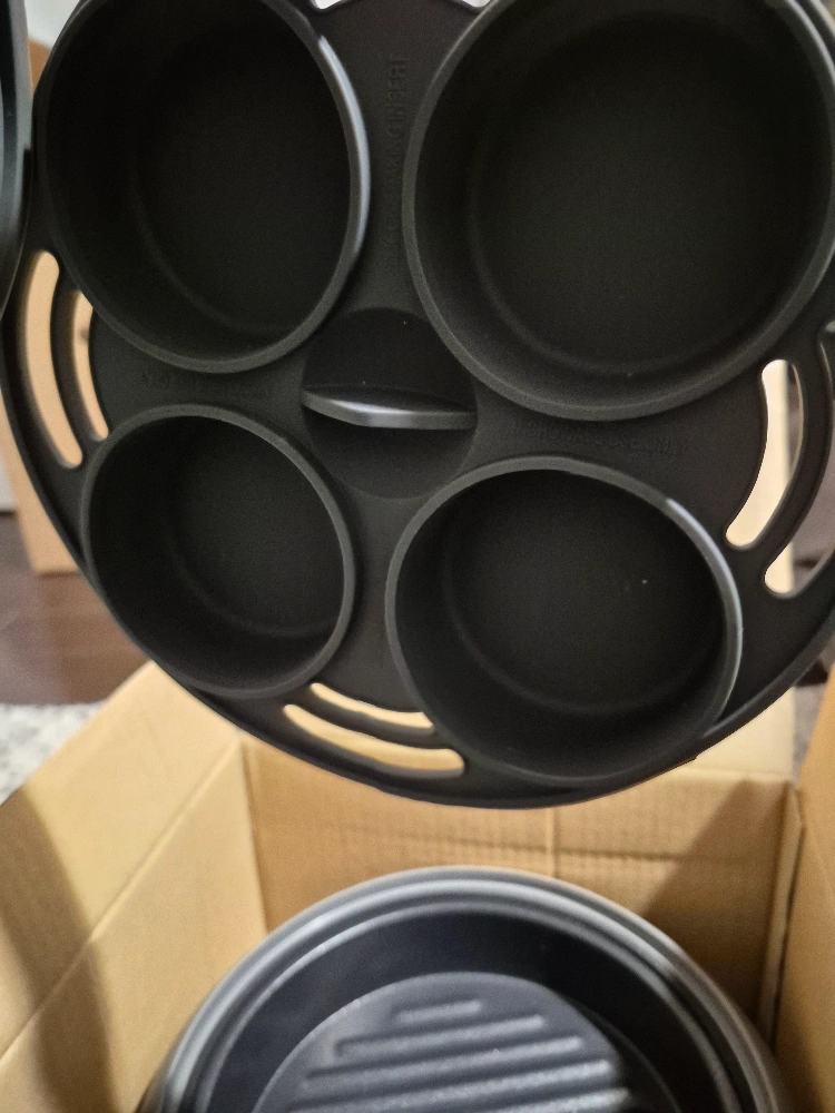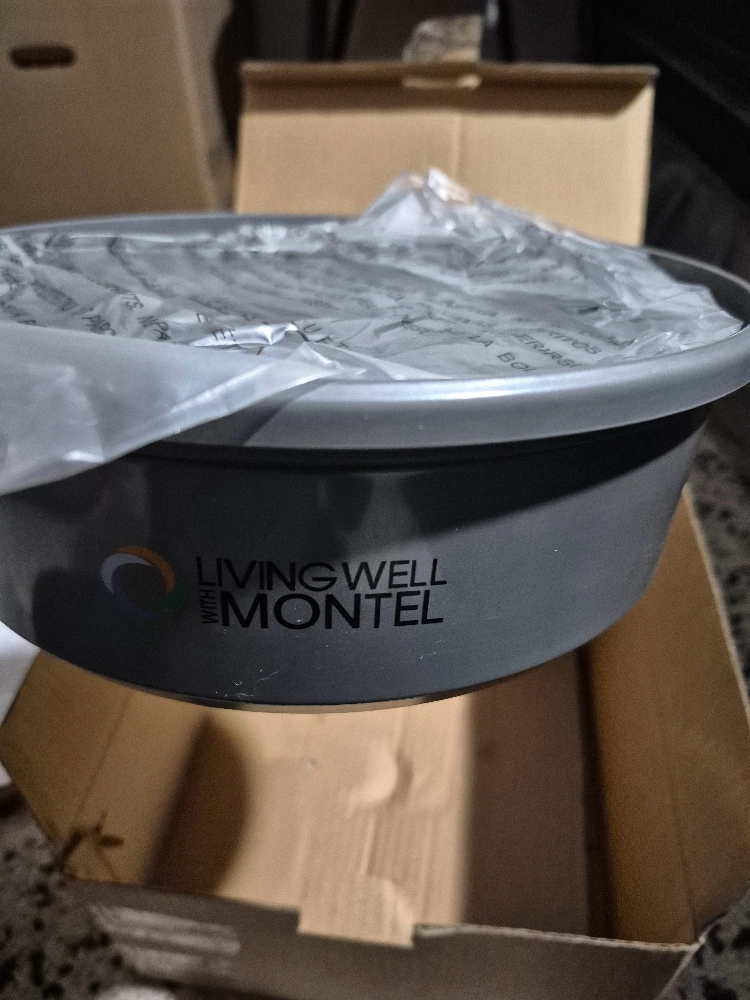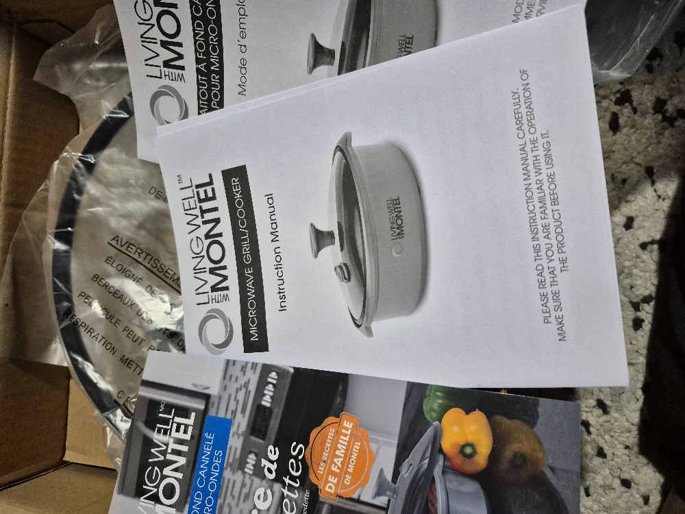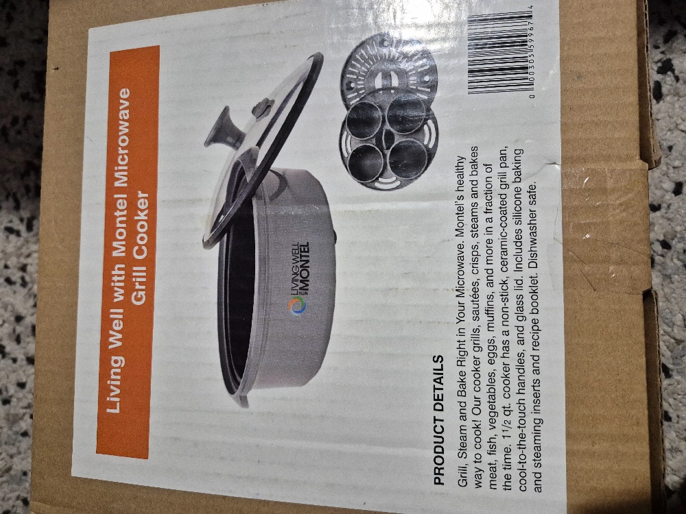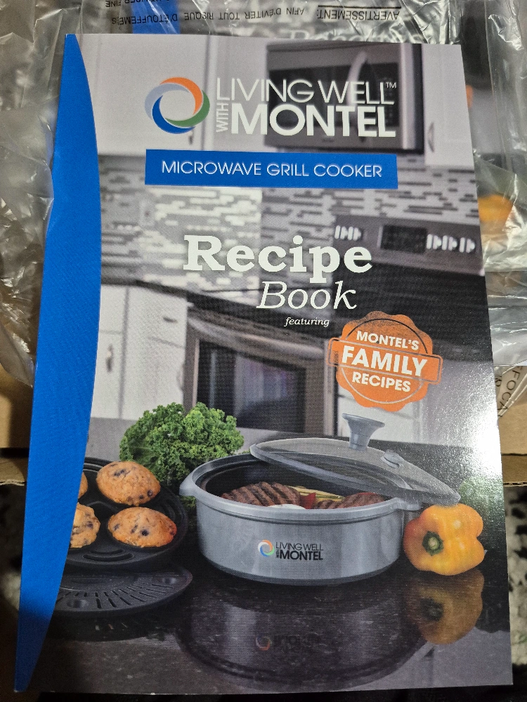 Microwave grill cooker, grey. Includes recipe book featuring family recipes. New, in box. Instruction manual included. open box