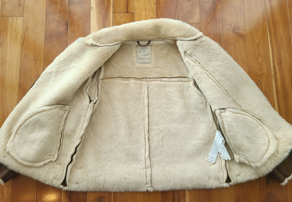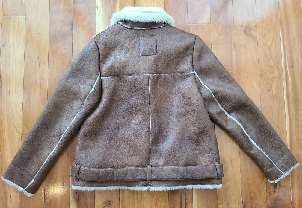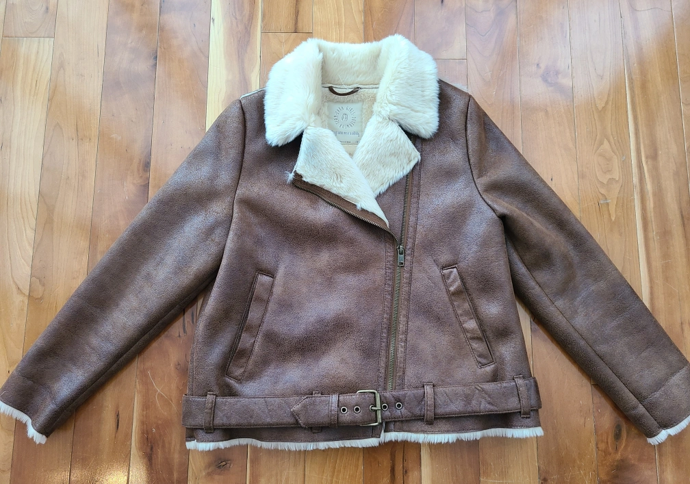 Brown faux leather aviator jacket. Features a cream faux fur collar and lining. Zipper closure and belted waist. Size 11/12 152cm