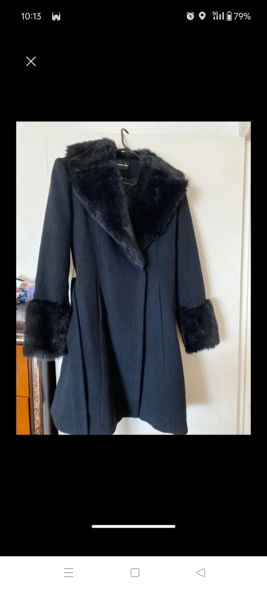 Beautiful black coat. Features a large faux fur collar and cuffs. Belted waist. Excellent condition.