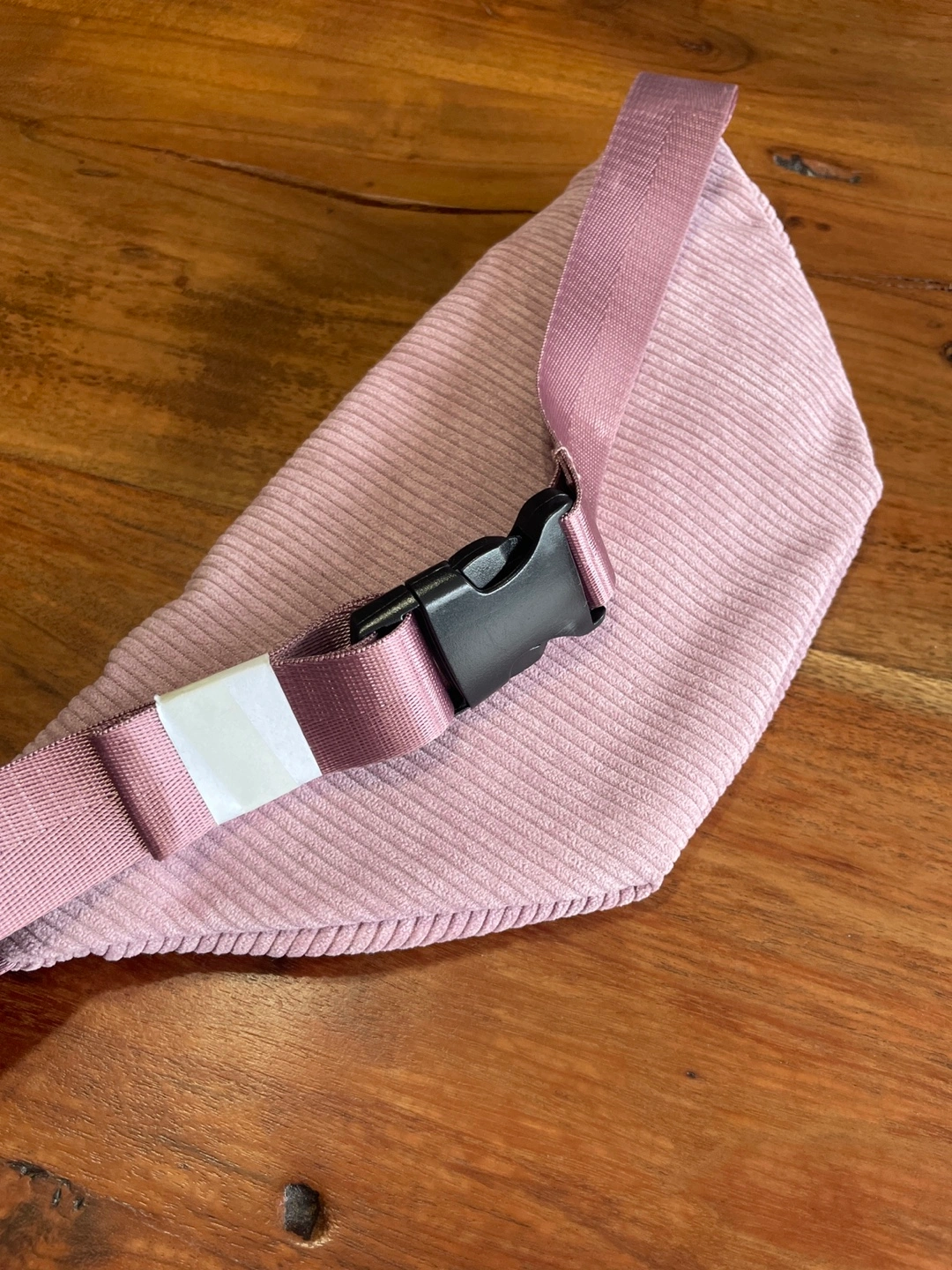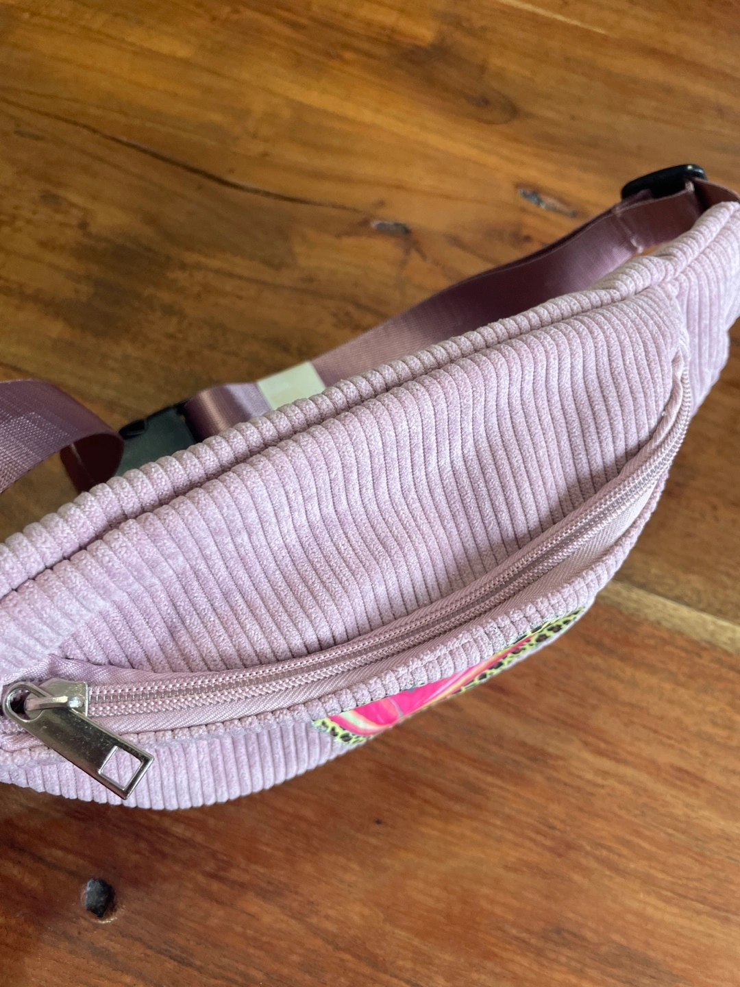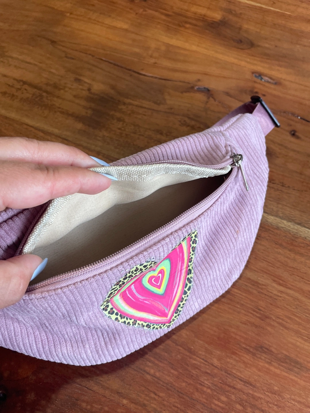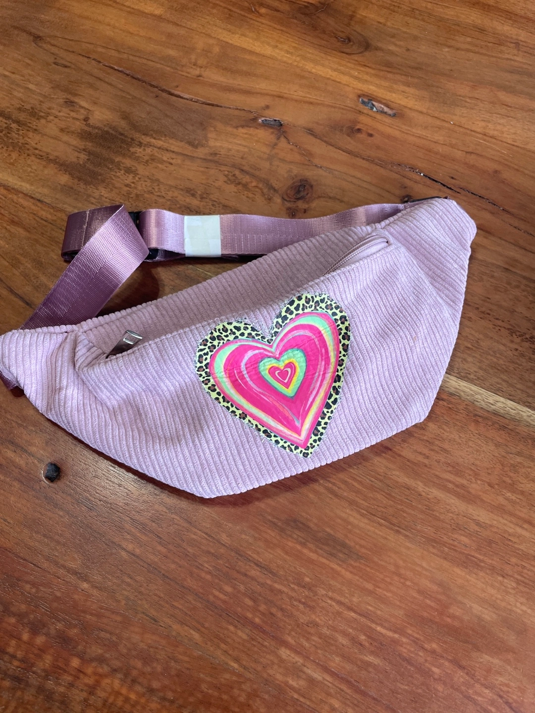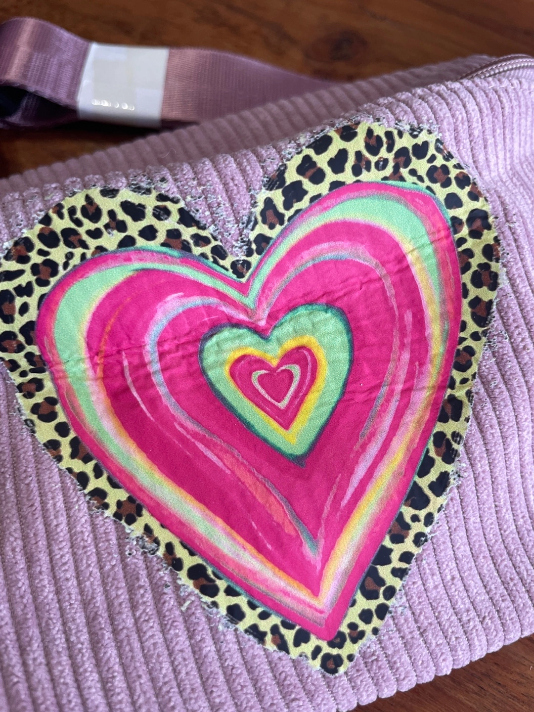 Adorable corduroy fanny pack. Features a pink, green, and yellow heart design with a leopard print accent. Adjustable strap. Zipper closure. Small, lightweight, and perfect for everyday use.