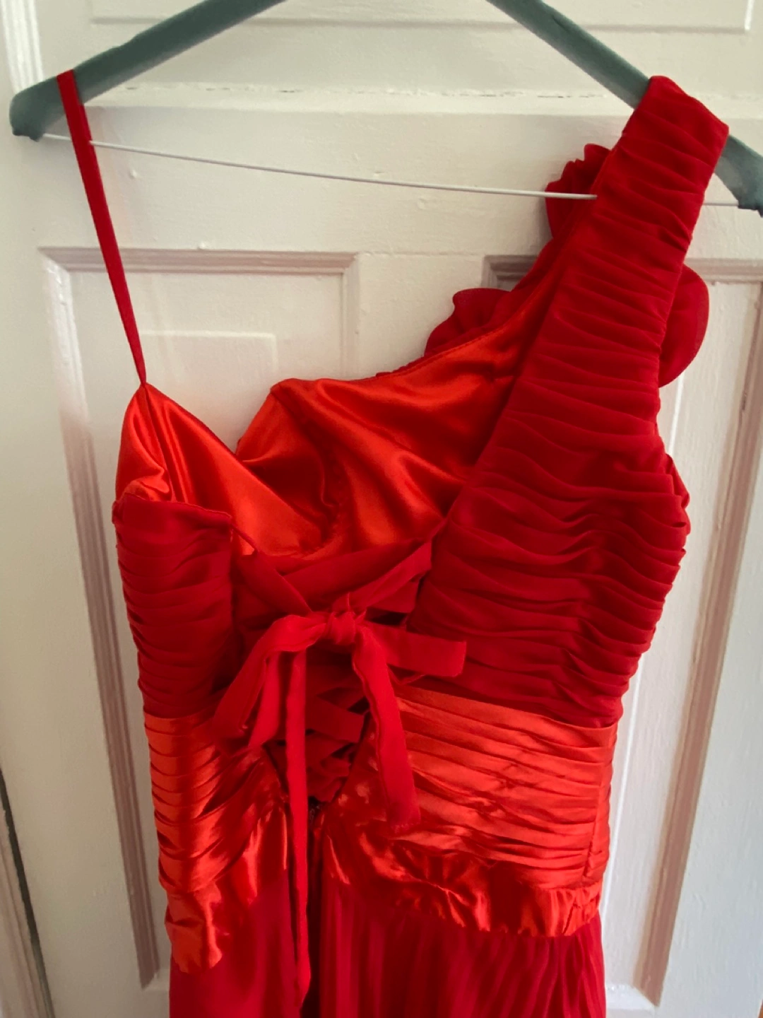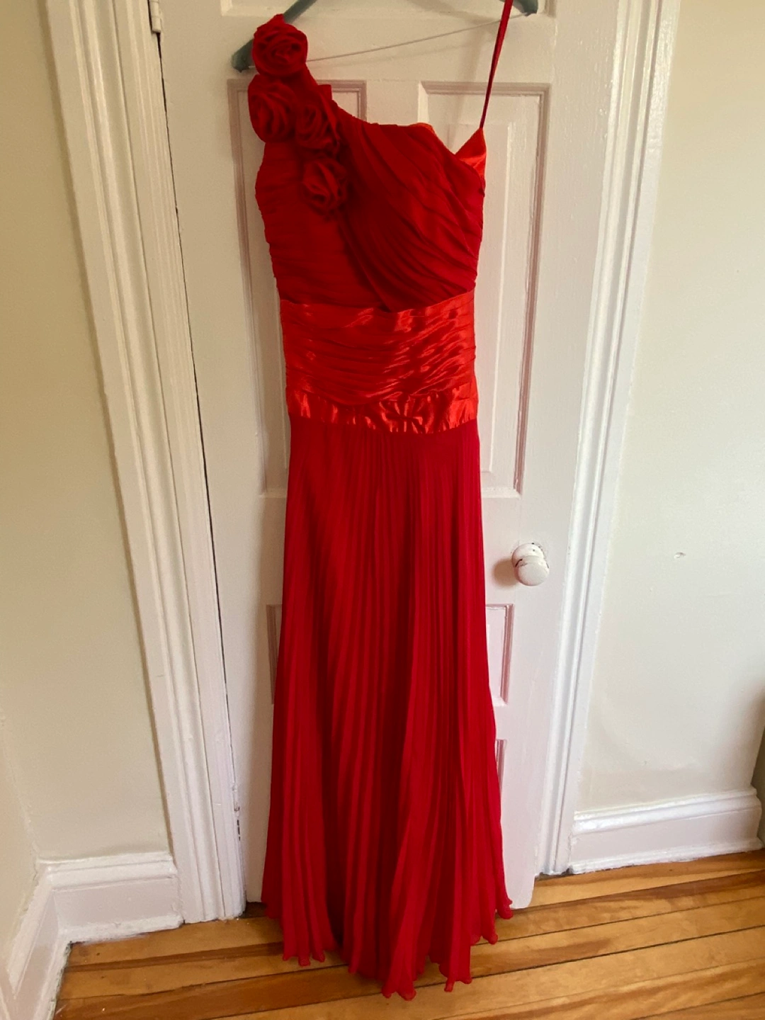 Red floor-length gown. Features a one-shoulder design with pleated chiffon fabric. Accentuated with beautiful fabric roses. Back features a satin corset-style lacing. Perfect for prom, a wedding, or other formal event. Worn once. And dry cleaned.