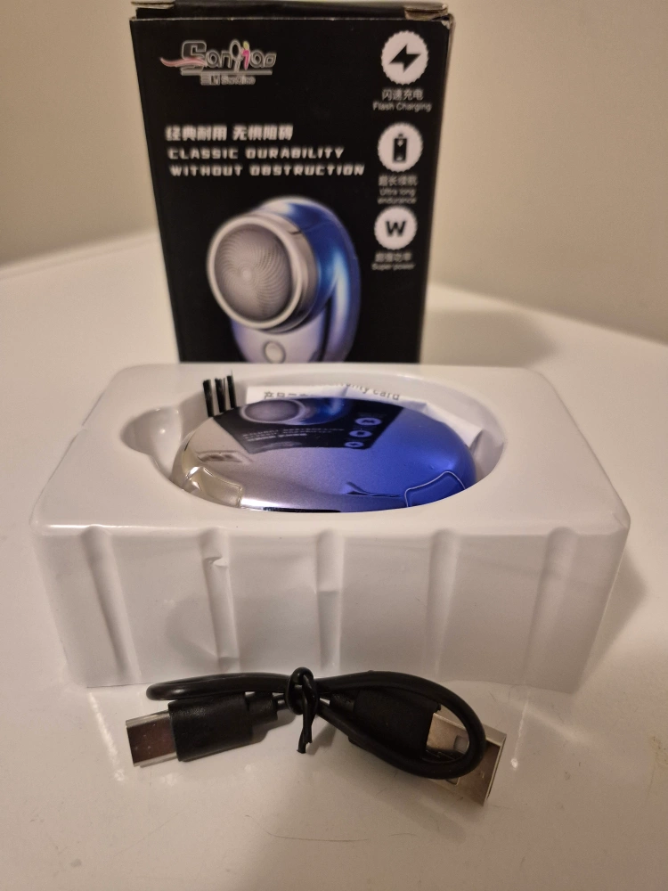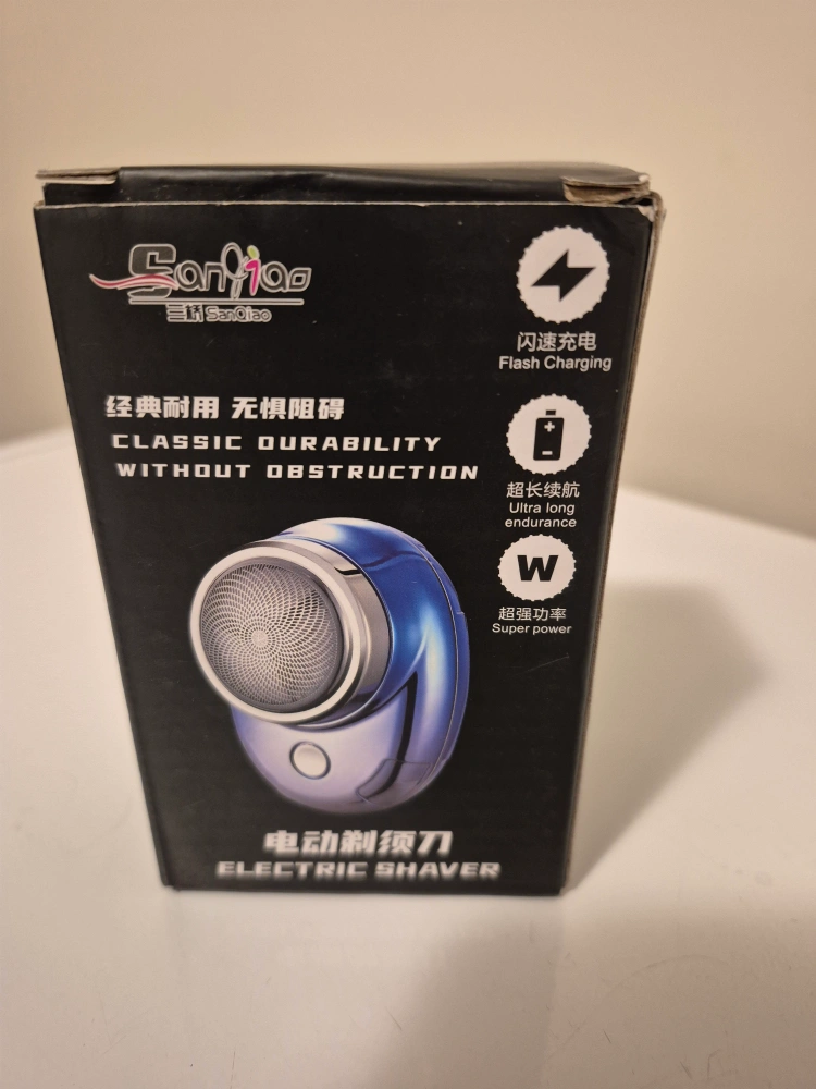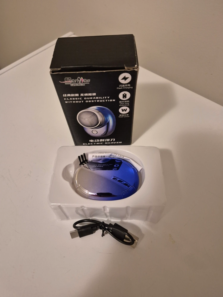 Portable electric shaver. Blue and Silver. USB rechargeable. Used, three times and now cleaned. Comes in original packaging. Make an offer and it probably can be yours. Delivery for an extra $5 within fifteen minutes of my downtown apartment. Curbside pickup M-Sat 4:30pm-10pm