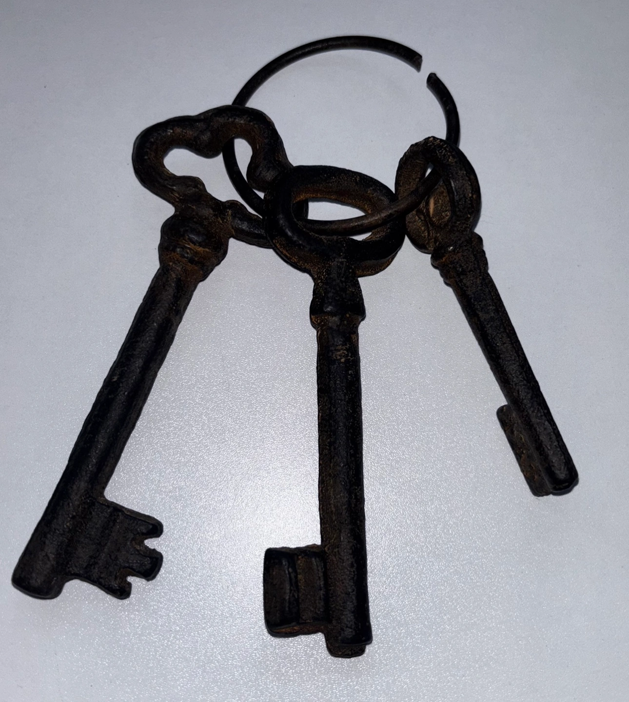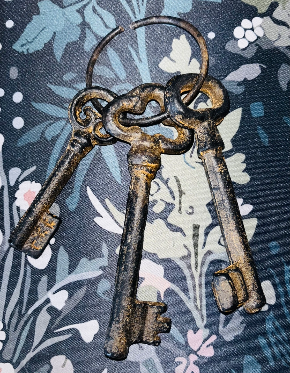 Three decorative skeleton keys on a ring. Dark metal finish. Great for home decor, Vintage rustic look.