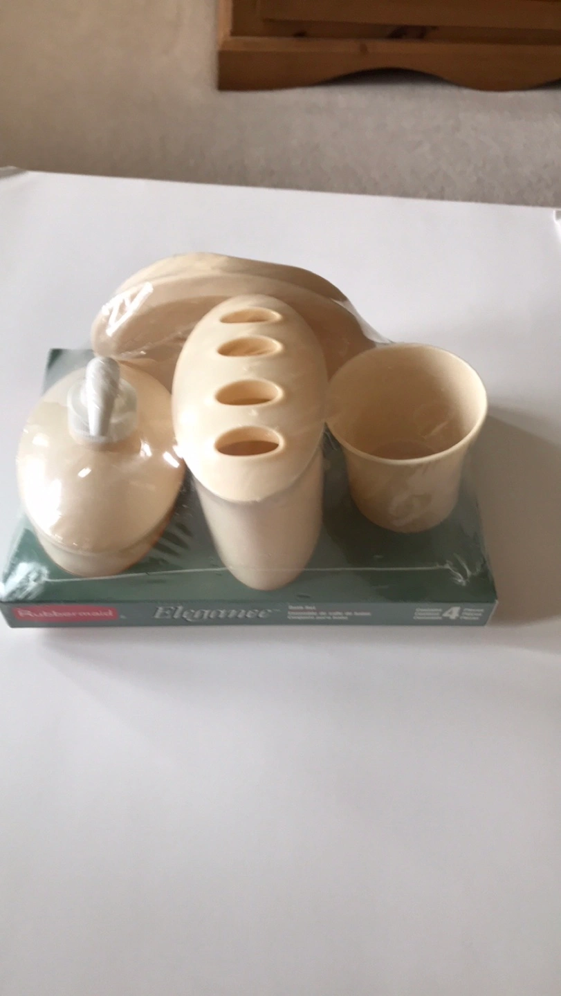 New, unopened Rubbermaid Elegance bath set. Cream coloured plastic. Includes soap dish, toothbrush holder, tumbler, and liquid soap dispenser. Perfect for a classic bathroom.