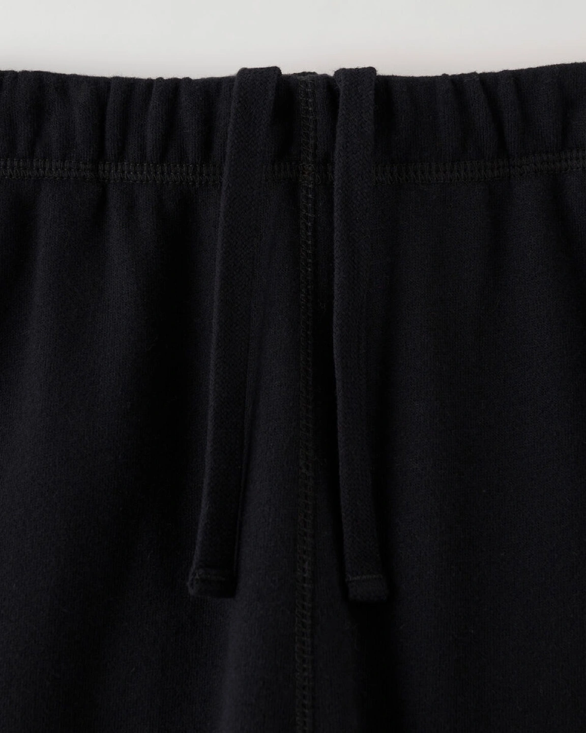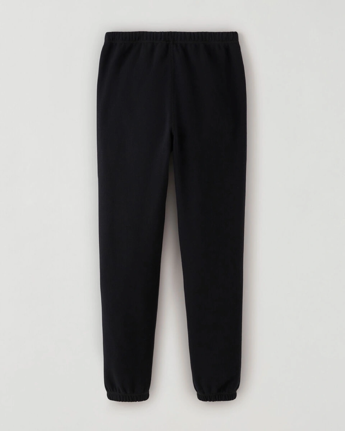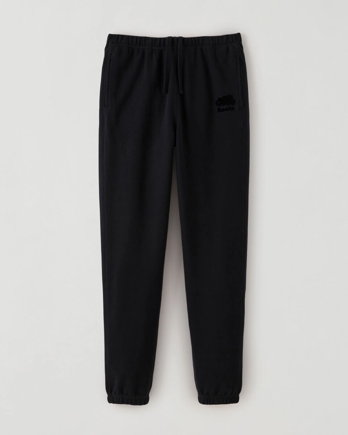 Black fleece joggers. Elastic waistband with drawstring. Cuffed bottoms. Roots logo on leg. Great for lounging or working out.