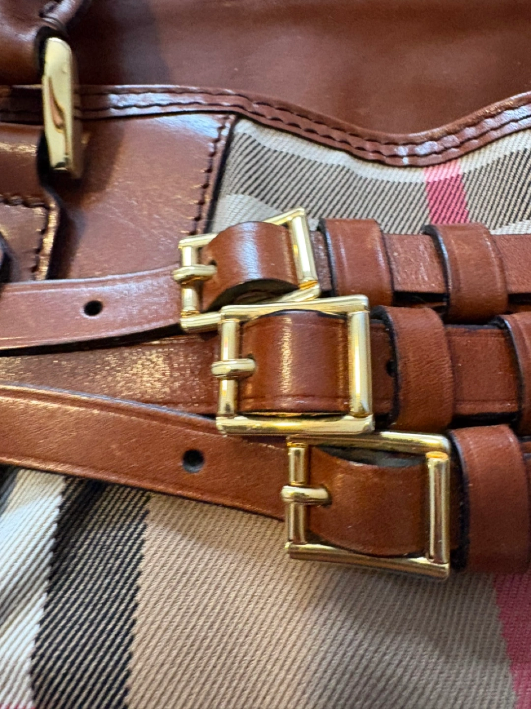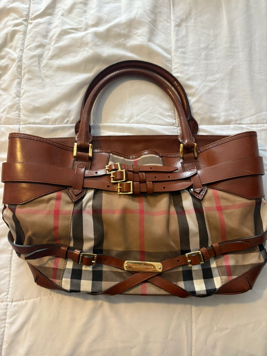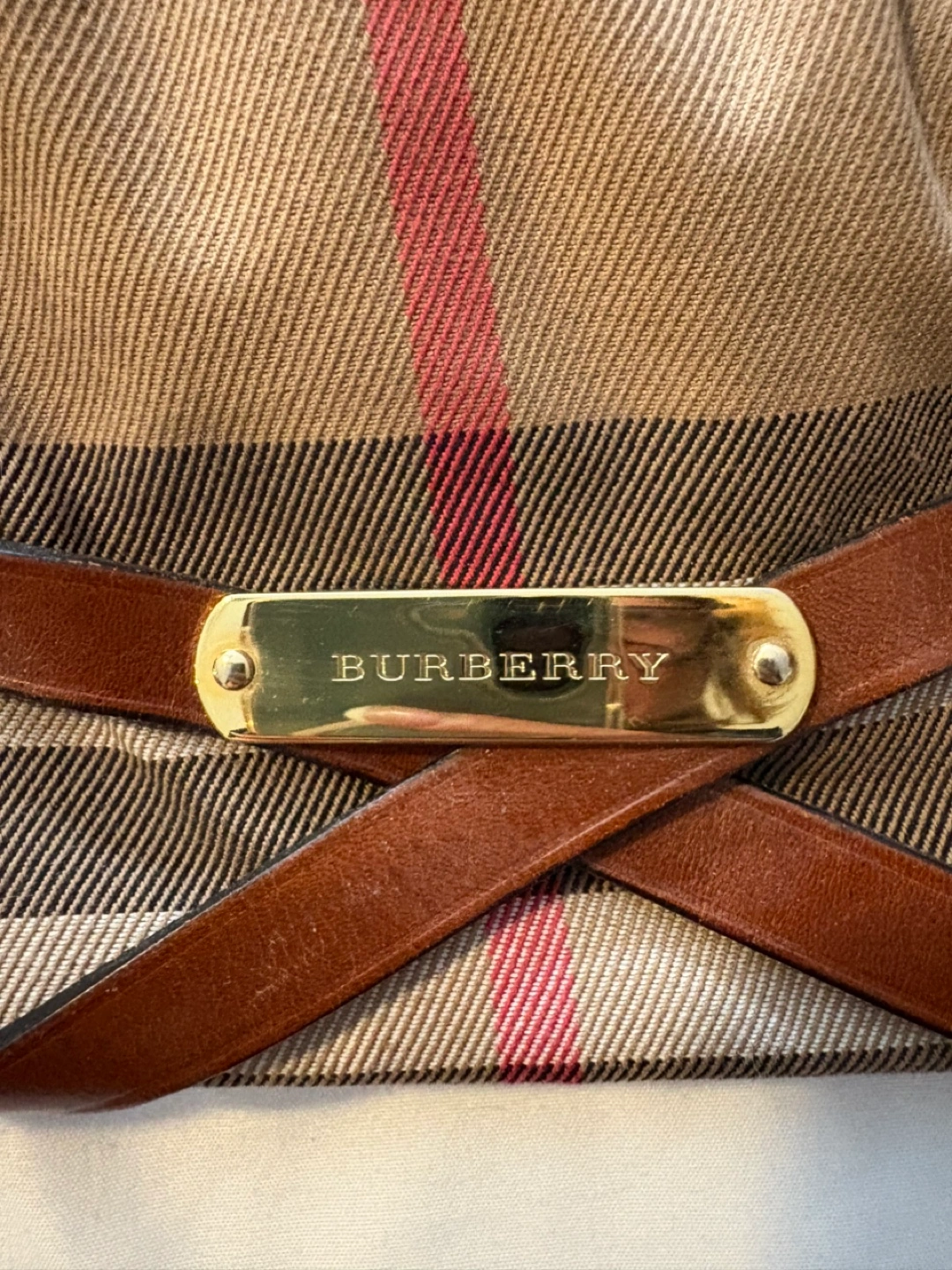 Pre-owned authentic Burberry tote bag. Brown leather trim and signature check pattern. Multiple compartments. Made in Italy.