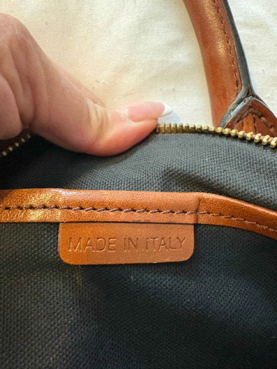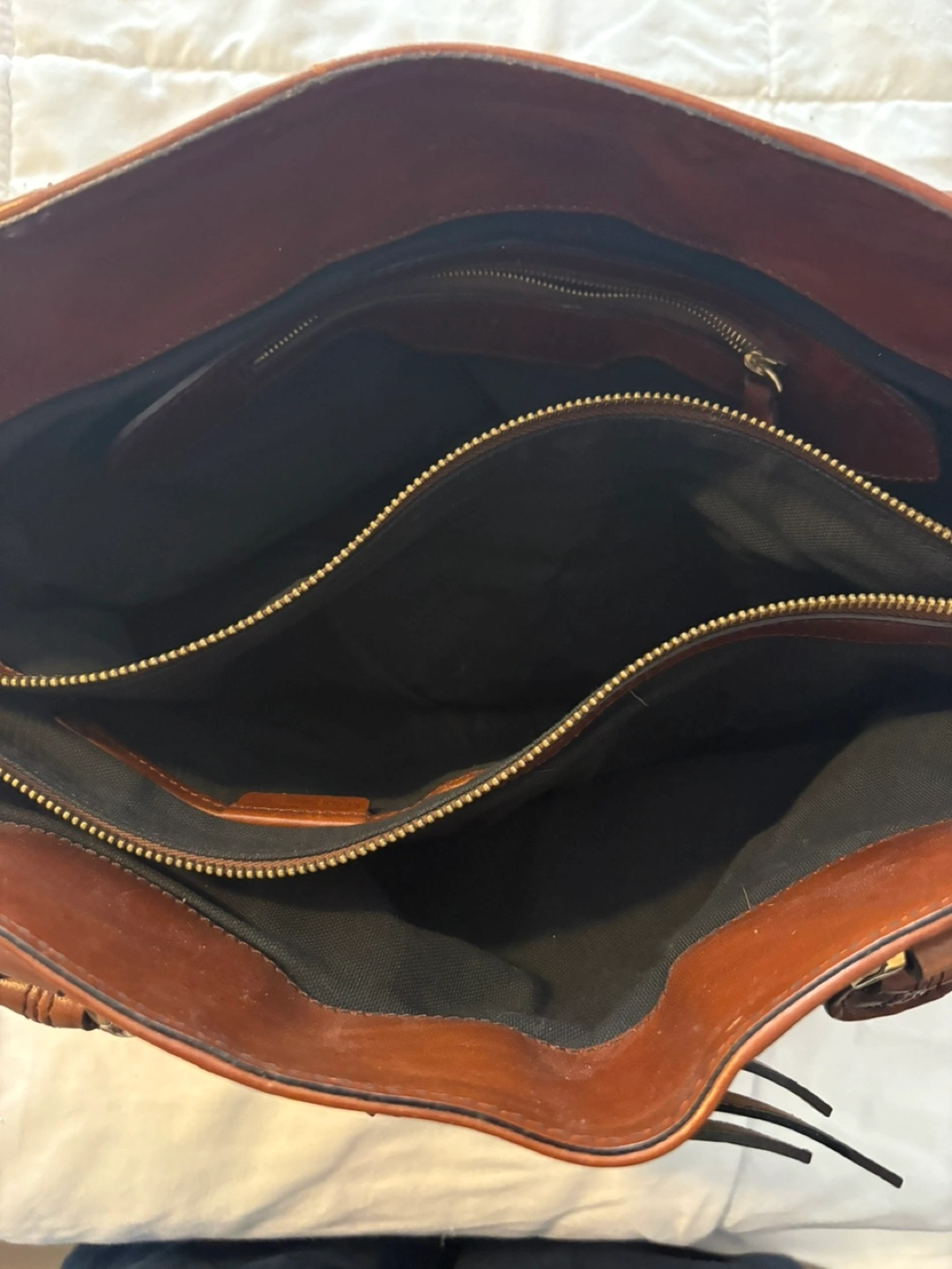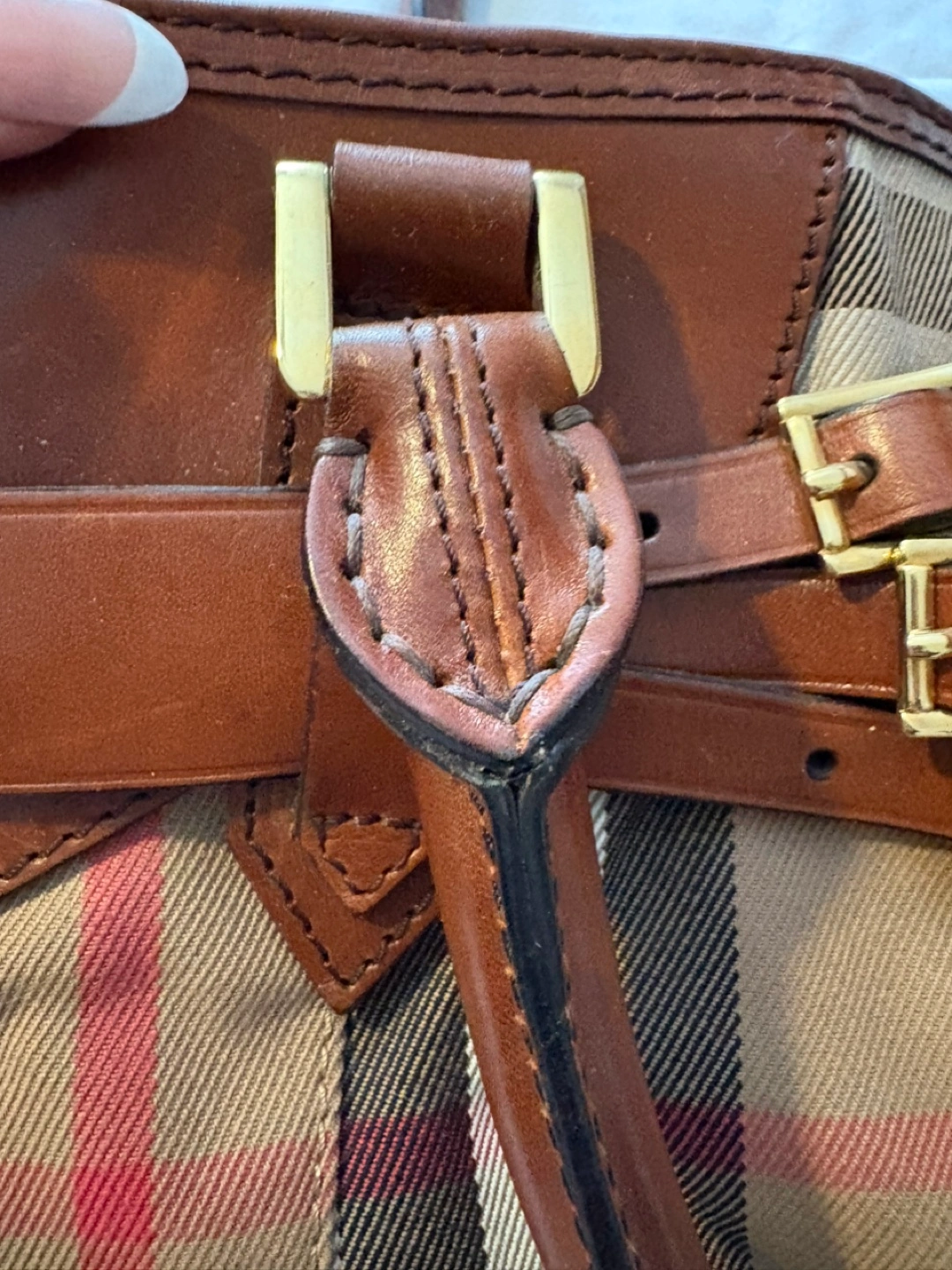 Pre-owned authentic Burberry tote bag. Brown leather trim and signature check pattern. Multiple compartments. Made in Italy.