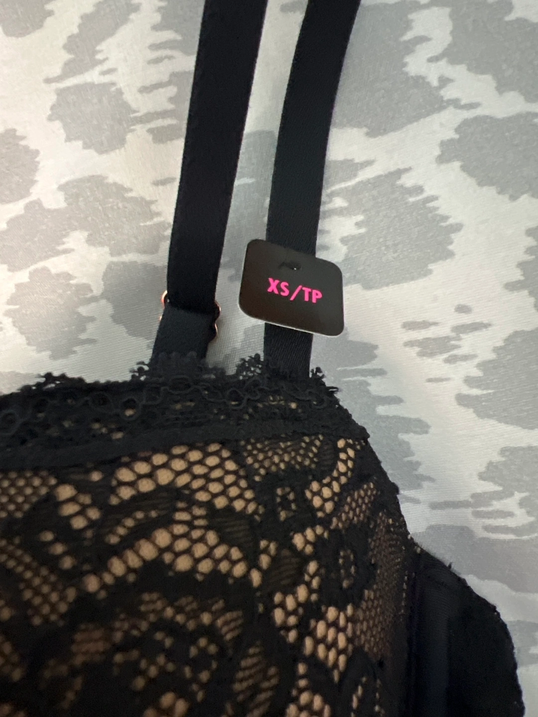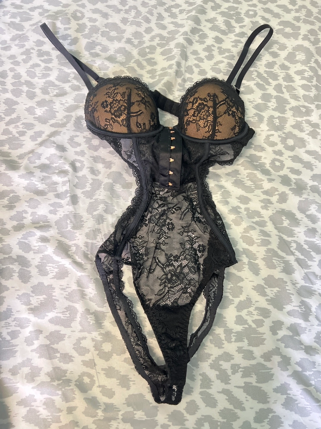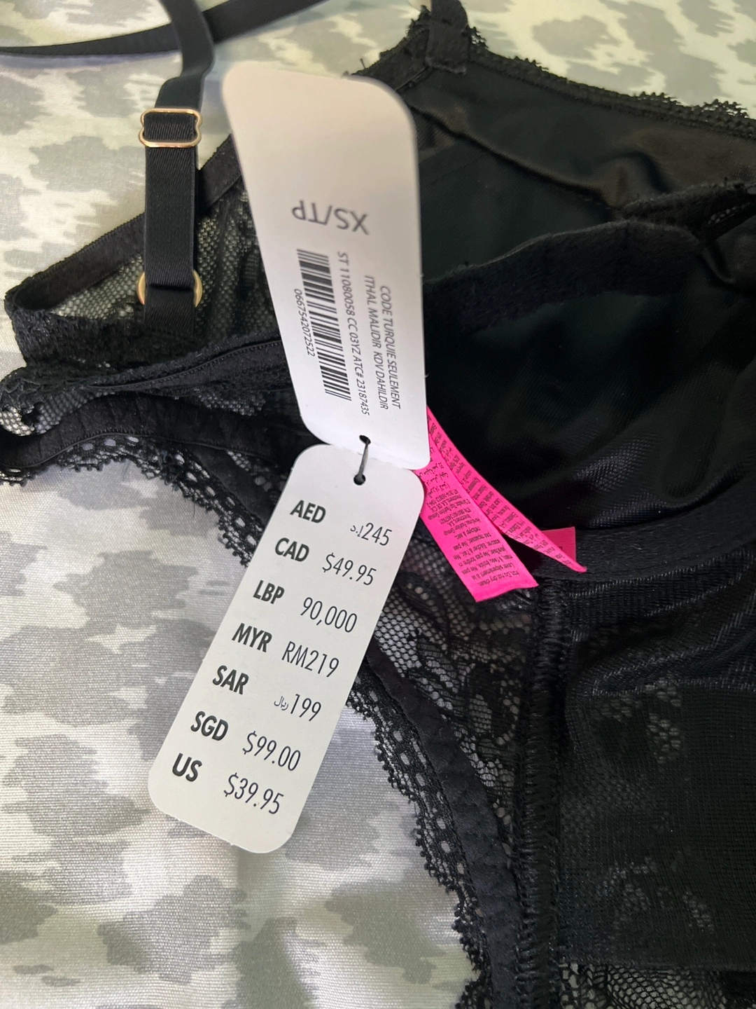 La Senza Black lace bodysuit. Features a lace-up front and delicate floral pattern. XS/TP size. Brand New with tags. Purchased for $50 plus taxes; selling for $25 cash. Pick up in person only.