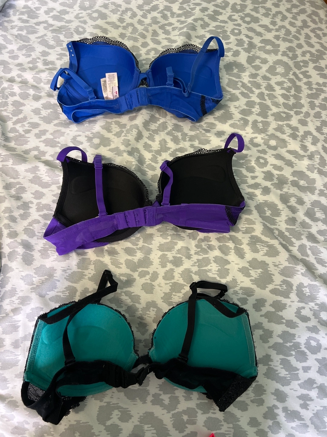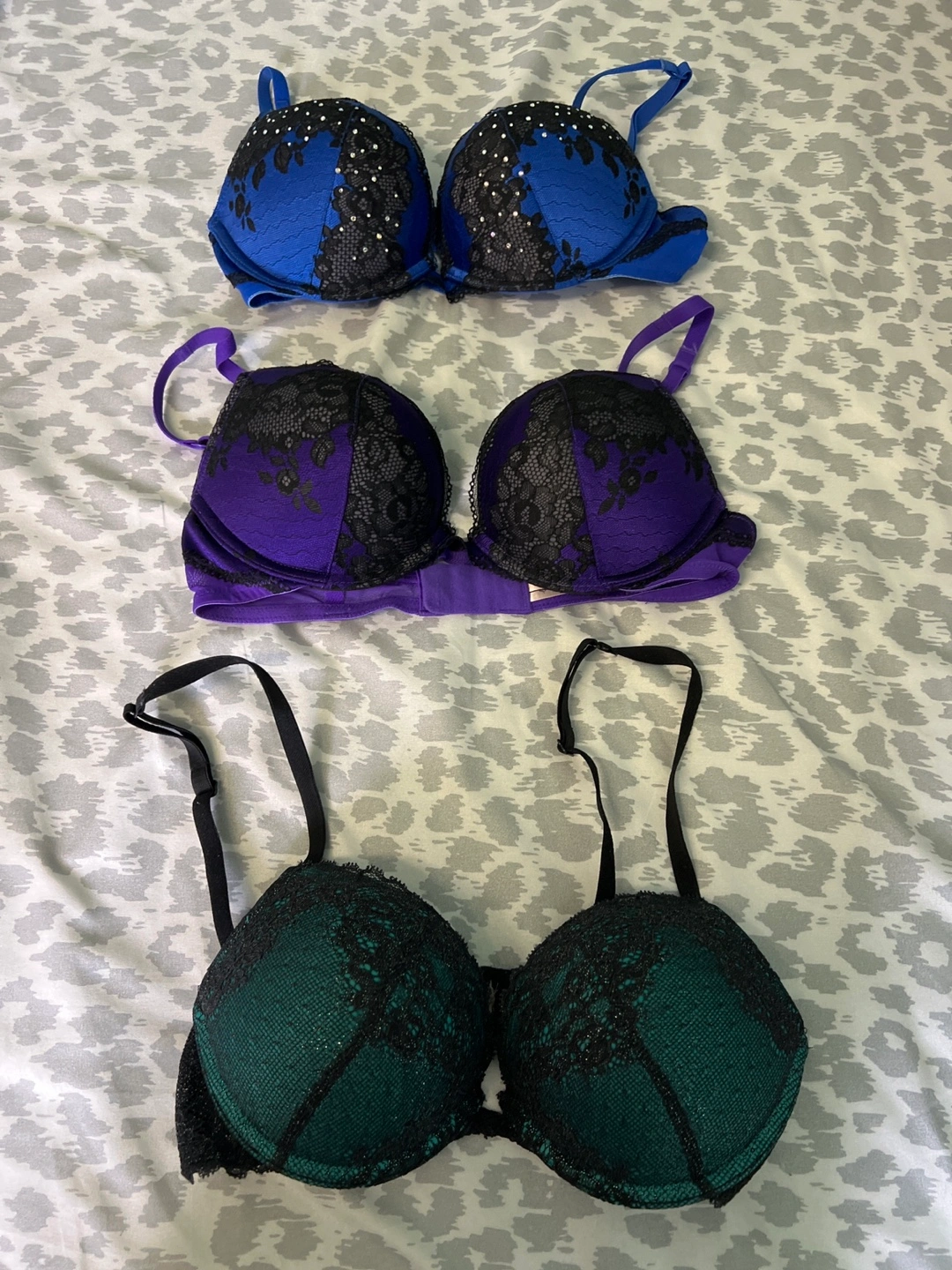 Three La Senza bras in Blue, purple, and green with black lace detailing. Push-up style. Excellent condition. $15 blue bra with rhinestones (32B). Like new condition. $10 purple lace bra (32B). Like new condition. $5 for green bra. Tags cut off so size is not there; it’s a 32B. Good condition. Pick up in person and cash only.